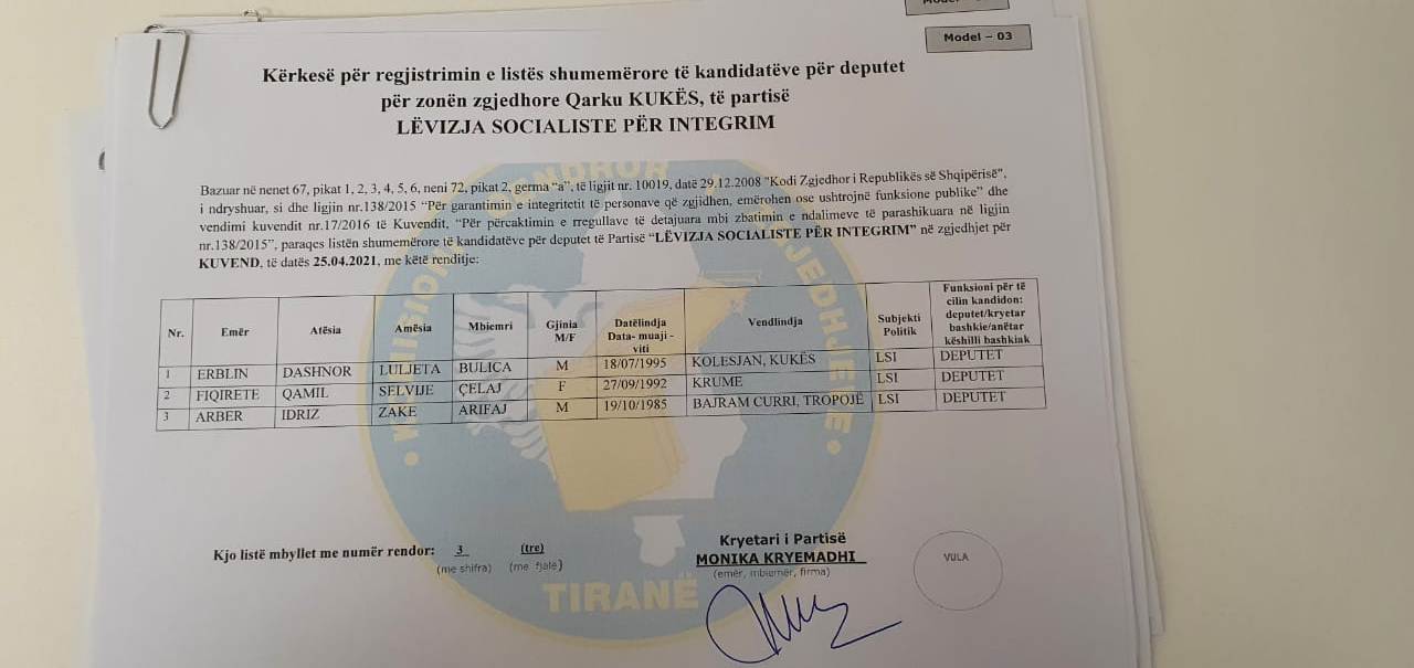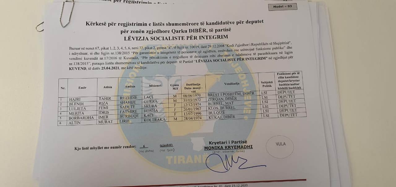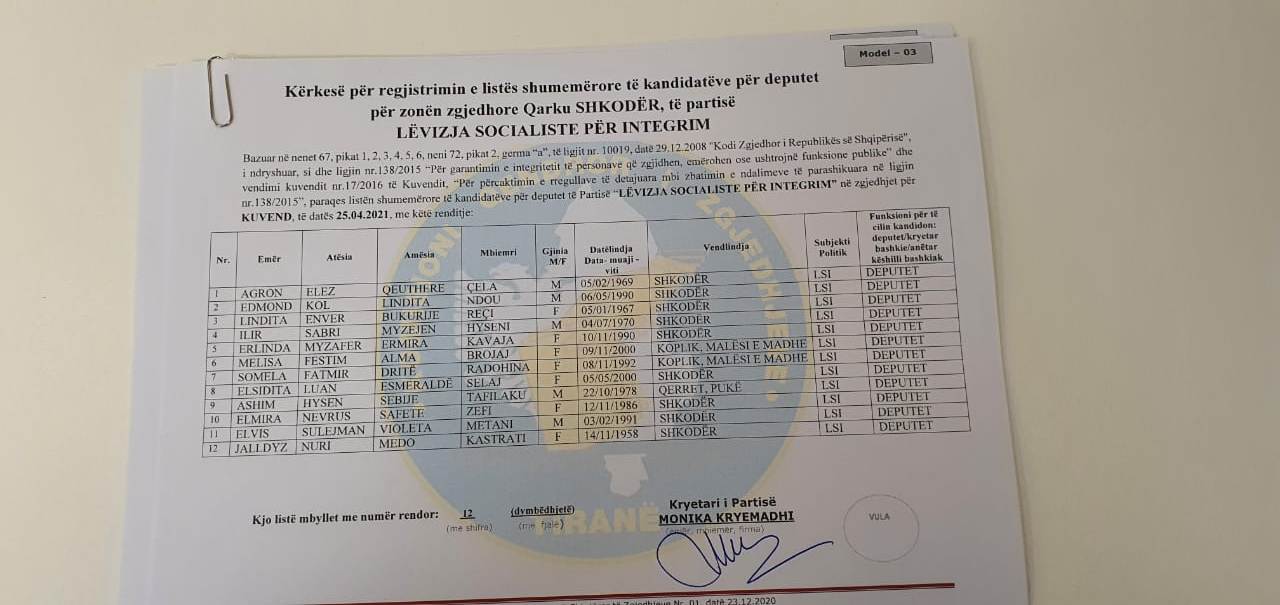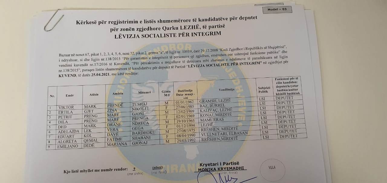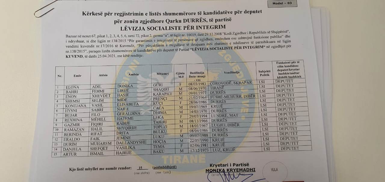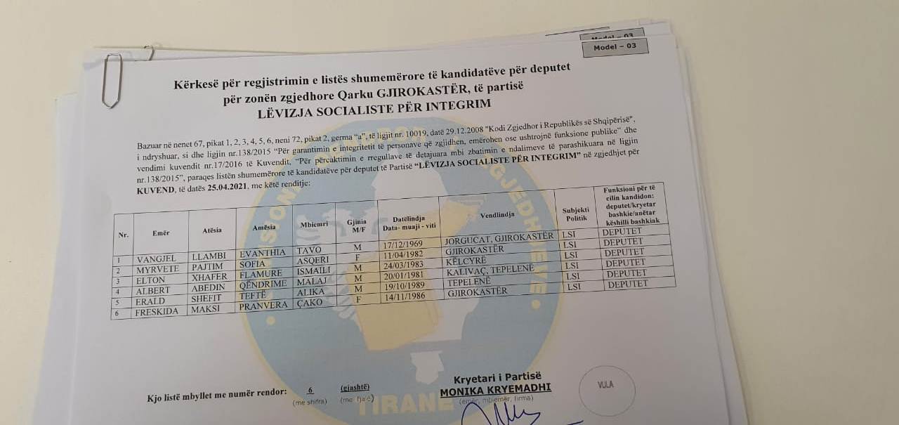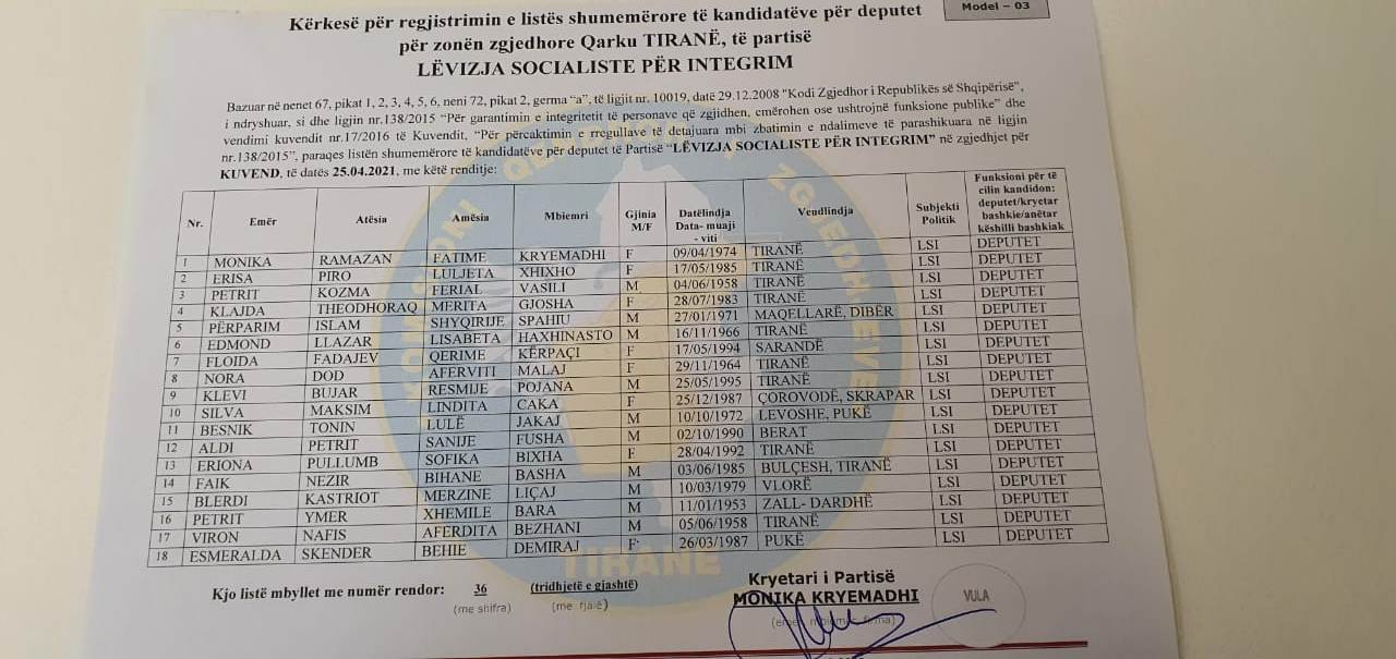 Vetë Kryemadhi vetë do të kandidojë në tre qarqe në Tiranë, Fier dhe Elbasan ku ka dalë e mandatuar në zgjedhjet e 2017. Në të tre qarqet do të jetë e para. Listat janë depozituar pranë Komisionit Qendror të Zgjedhjeve. Pas prezantimit të emrave, ajo tha se ata janë profesionistë në fusha të ndryshme.