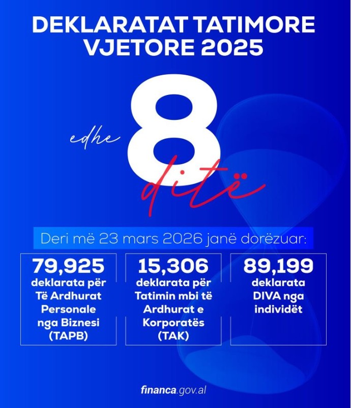 Drejtoria e Përgjithshme e Tatimeve inkurajon tatimpaguesit të dorëzojnë deklaratat përpara këtij afati për të shmangur vonesa dhe vështirësi që mund të lindin për shkak të fluksit të madh në sistem gjatë ditëve të fundit të deklarimit.