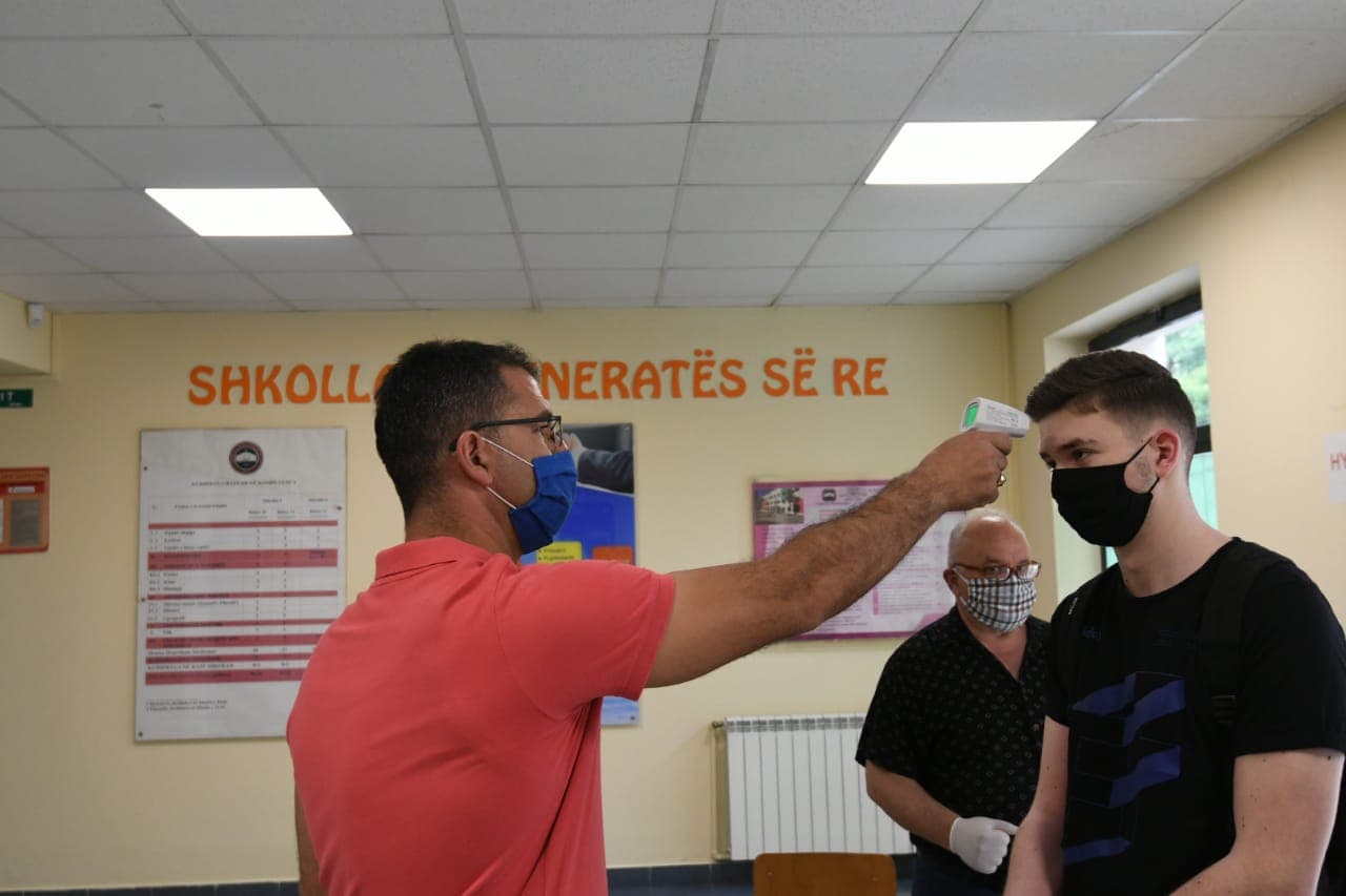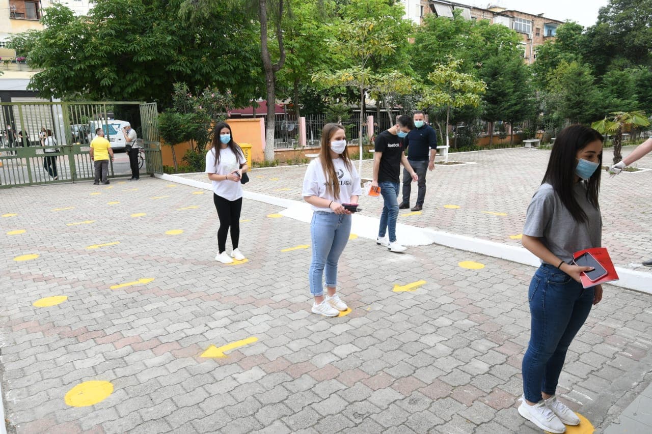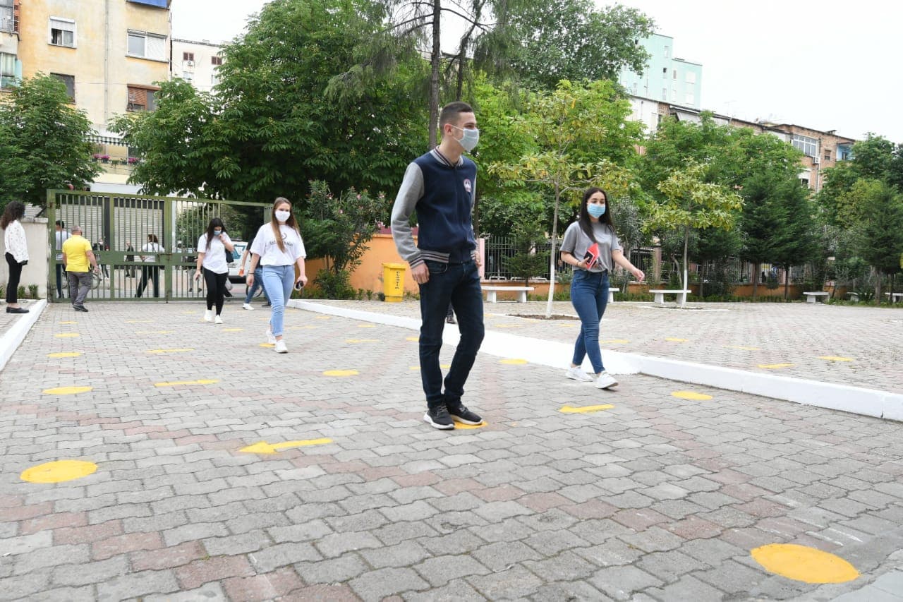 Edhe në gjimnazet e Shkodrës maturantët i rikthehen shkollës në masa të rrepta higjineo-sanitare. Në hyrje u matet edhe temperatura, ndërsa brenda ambienteve janë përcaktuar përmes shigjetave se si duhet të ecin në mënyrë që të mos përballen me fytyrë me njëri-tjetrin.