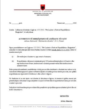 Përmes një letre drejtuar Autoritetit të Mbikëqyrjes Financiare, ministri i Financave, Arben Ahmetaj kërkon që të nisa puna me qëllim zbatim e ligji për lojërat e fatit brenda afatit të përcaktuar.