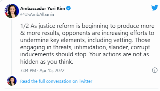 Ambasadorja amerikane Yuri Kim: Kujdes, mos sulmoni Vettingun. Ne dijmë gjithçka kush po e organizon këtë frikësim dhe minim!