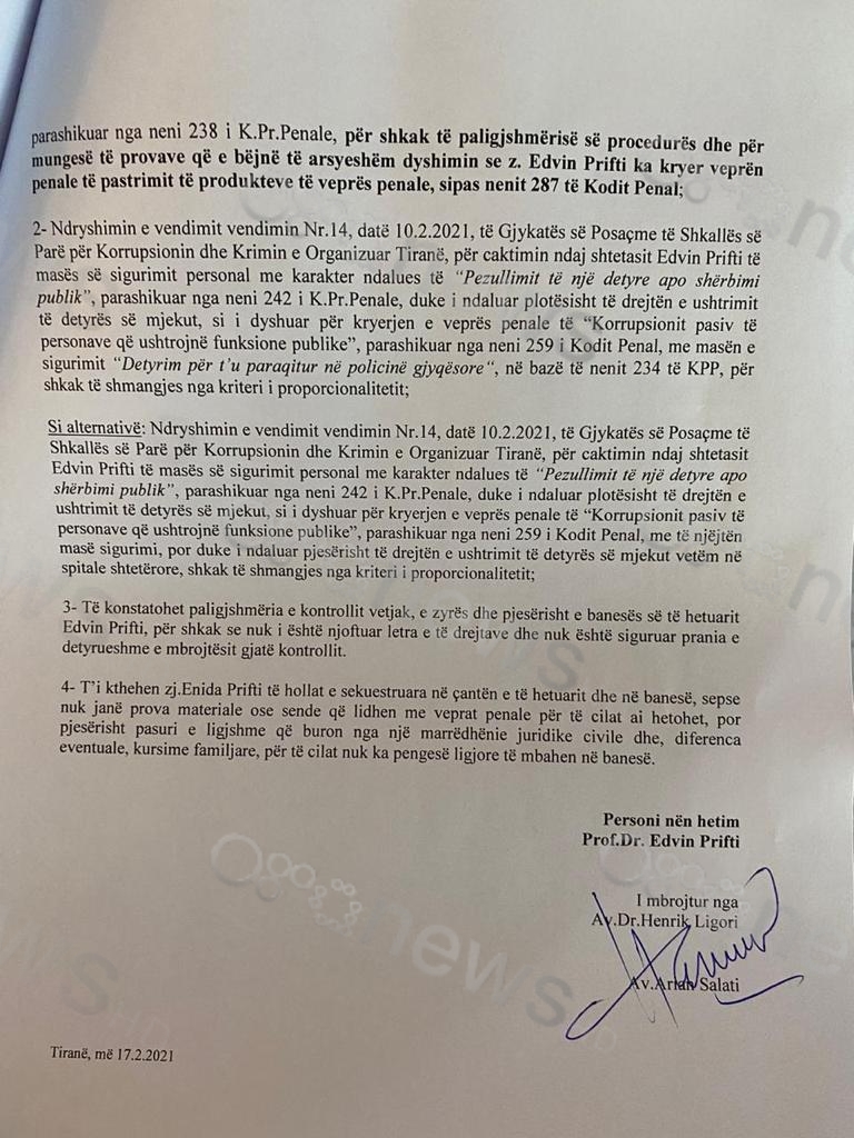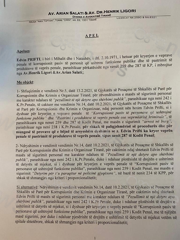 Kërkohet nga Apeli shfuqizimi i kësaj mase sigurie dhe vendosja e masës detyrim paraqitje si dhe kthimin e sasisë mnonetare, pasi sipas avokatit nuk janë prova apo sende që lidhen me veprat penale për të cilat mjeku po hetohet.