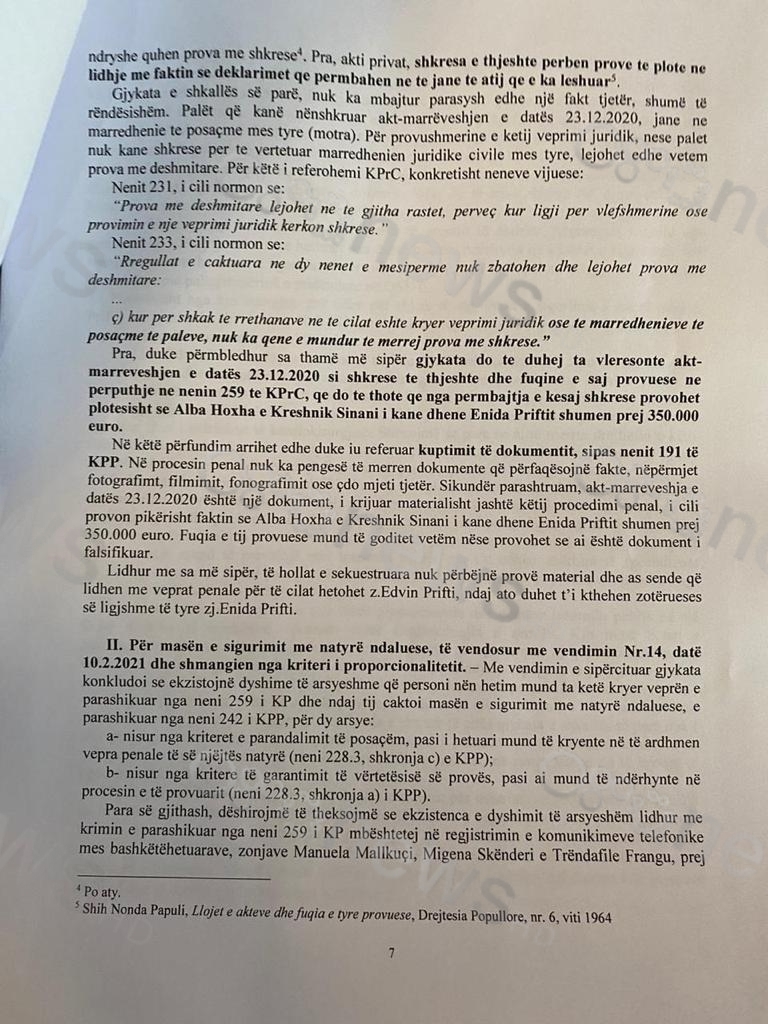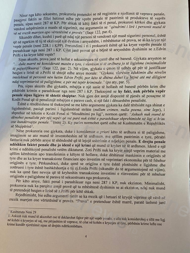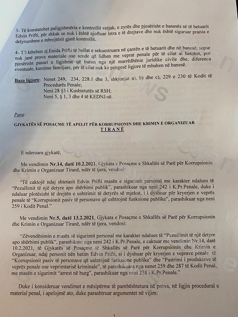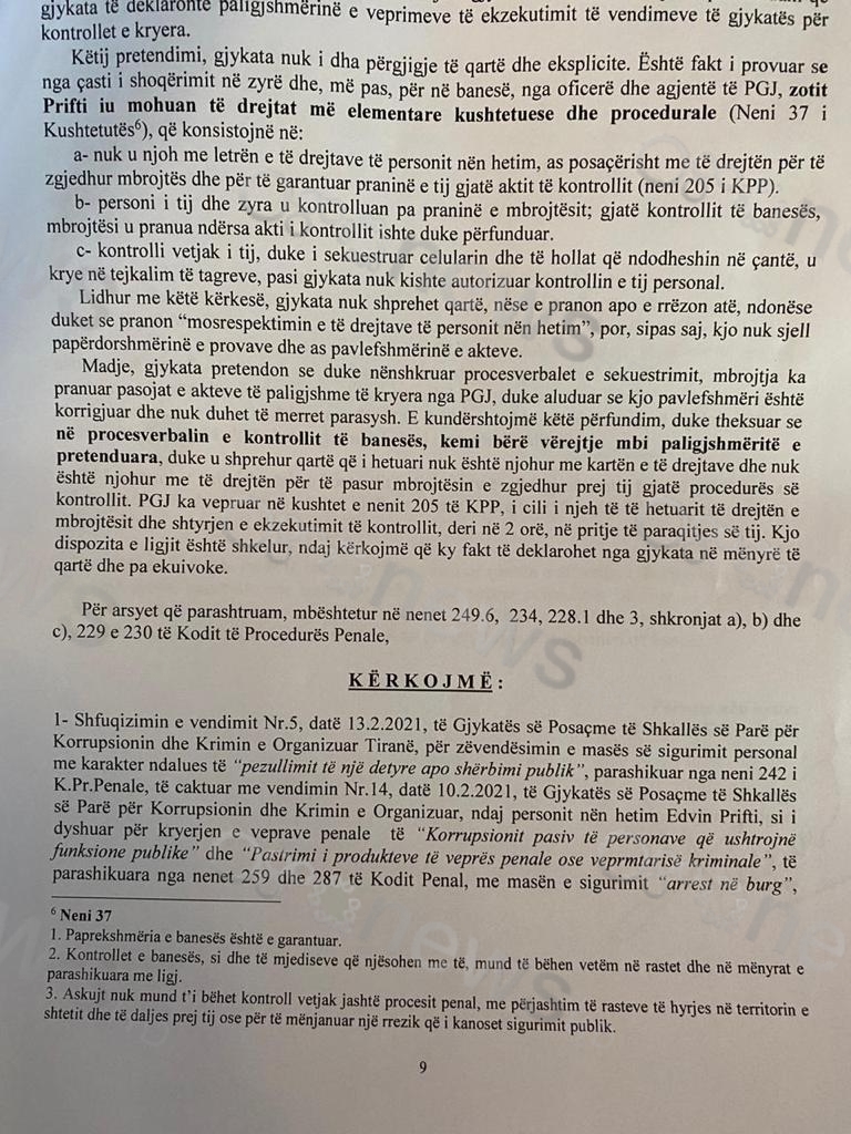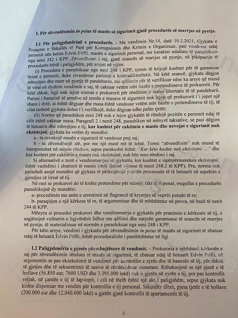 Paligjshmëria e pjesës përmbajtësore të vendimit: Prokuroria e mbështeti kërkesën e saj për zëvendësimin rëndues të masës së sigurimit, të zbatuar ndaj të hetuarit Edvin Prifti, në argumentimin se pas ekzekutimit të vendimit për kontrollin e zyrës dhe të banesës së tij, për shkak të gjetjes dhe të sekuestrimit të sasive të rëndësishme monetare.