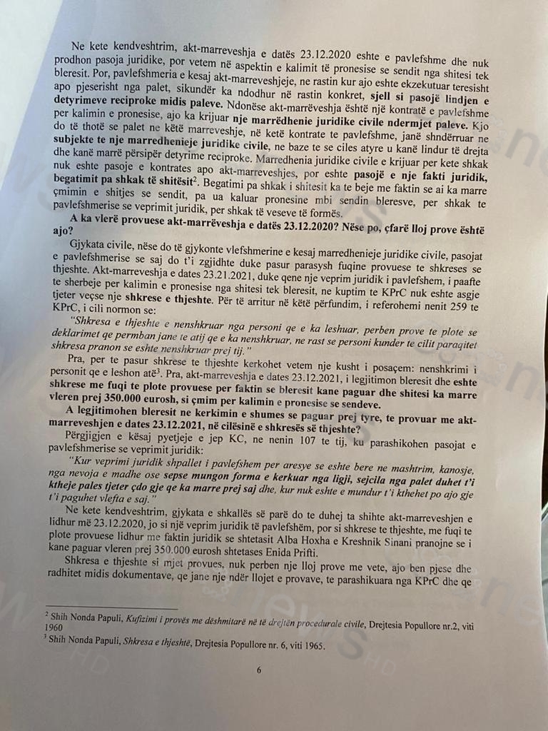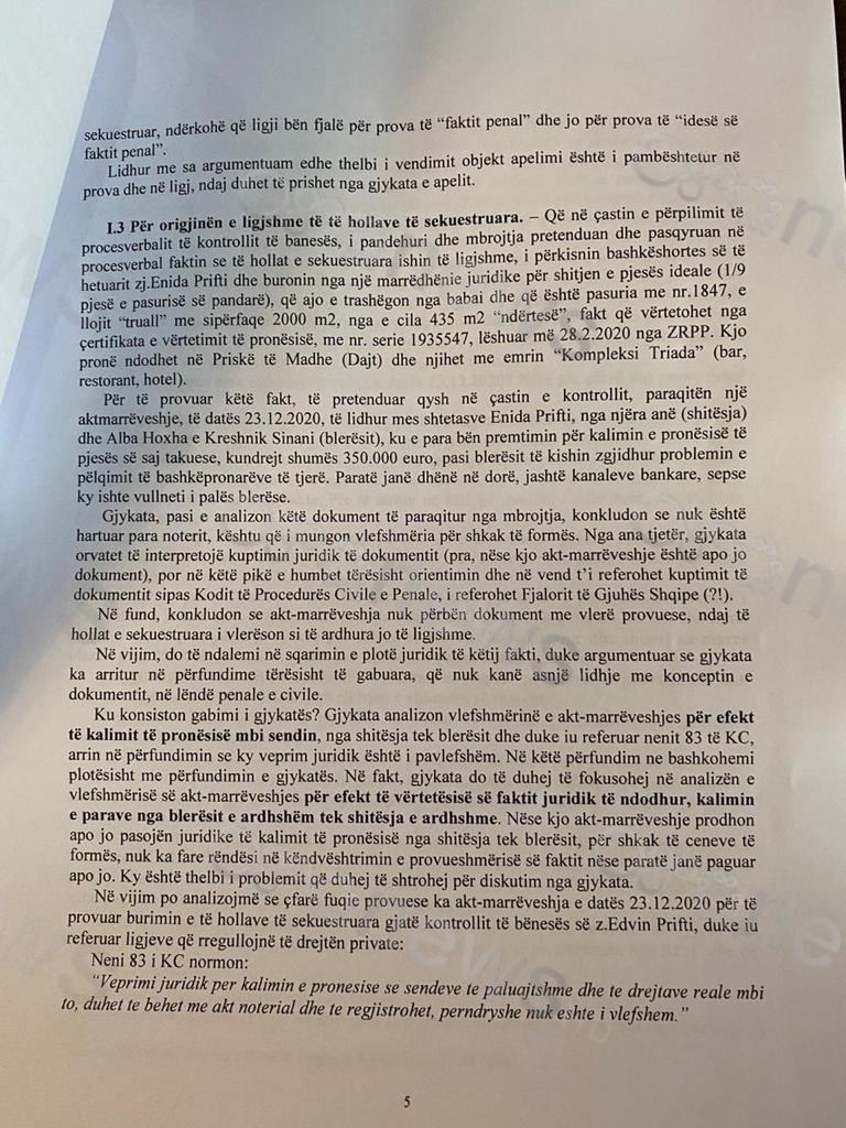 Ne dokumentet e avokateve thuhet se paratë i përkisnin bashkëshortes E. P dhe buronin nga marrëdhënie juridike për shitjen e pjesës trashëgimnisë nga babai me vlerë 350.000 euro. Kjo pronë i ishte shitur motrës së saj, A.H