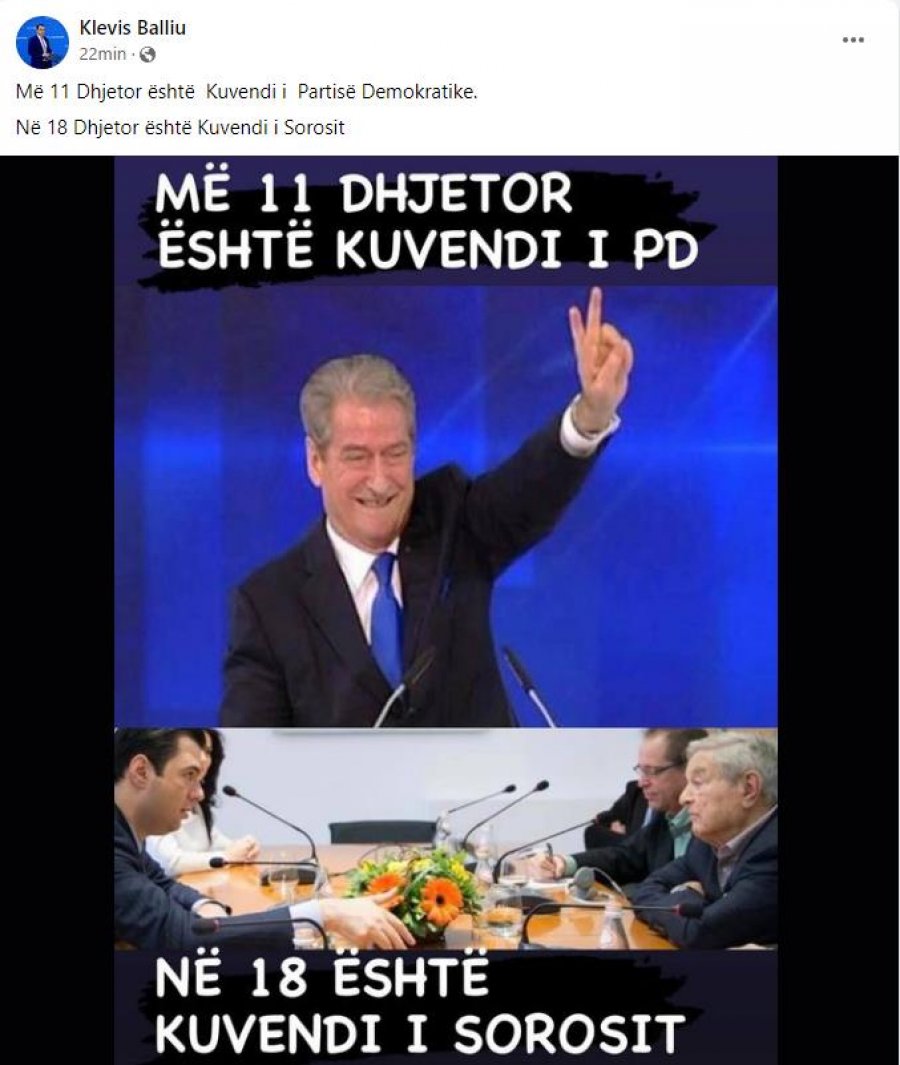 “Më 11 dhjetor është Kuvendi i Partisë Demokratike. Në 18 dhjetor është Kuvendi i Sorosit”, shkruan Balliu në shenimin e tij që e shoqëron edhe me një fotomontazh.