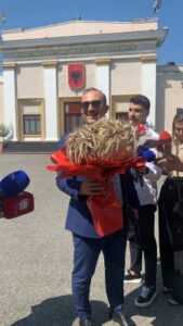 “Kjo është një buqetë nga fermerët e Myzeqesë, në pamundësi për të ardhur me shalqi, mbase vij javën tjetrër, meqë iu morën votën iua fusim pak dhe me çmim. Sot në bursë gruri është me 22 dollarë kuintali, të gjithë fermerët kanë dalë me humbje, presin ndonjë kokërr leku nga qeveria në formën e subvencionit”, tha Korreshi.