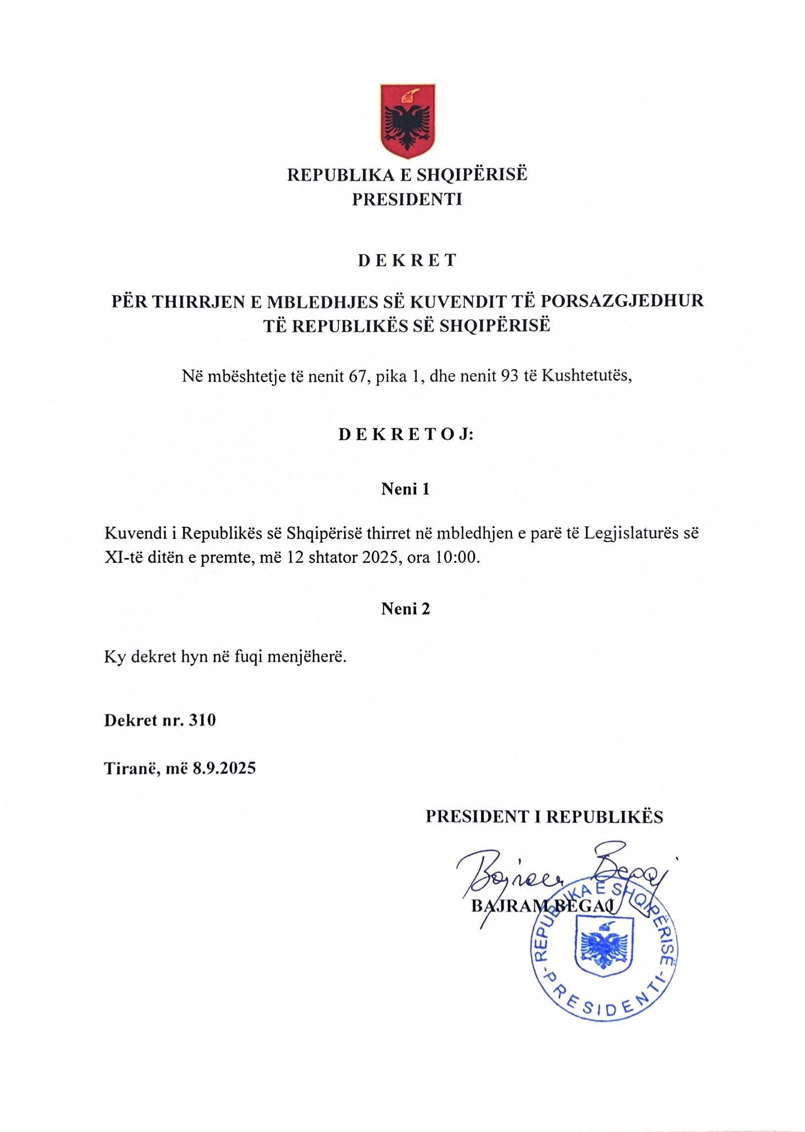 Presidenti i Shqipërisë, Bajram Begaj ka dekretuar datën 12 shtator, ora 10:00 për mbledhjen e Kuvendit të ri të dalë nga zgjedhjet e 11 Majit 2025. Në mesazhin drejtuar deputetëve, kreu i Shtetit thekson se vendi është në një moment historik, atë të anëtarësimit në Bashkimin Europian. Po ashtu vë theksin edhe tek një opozitë aktive që duhet në Kuvend.