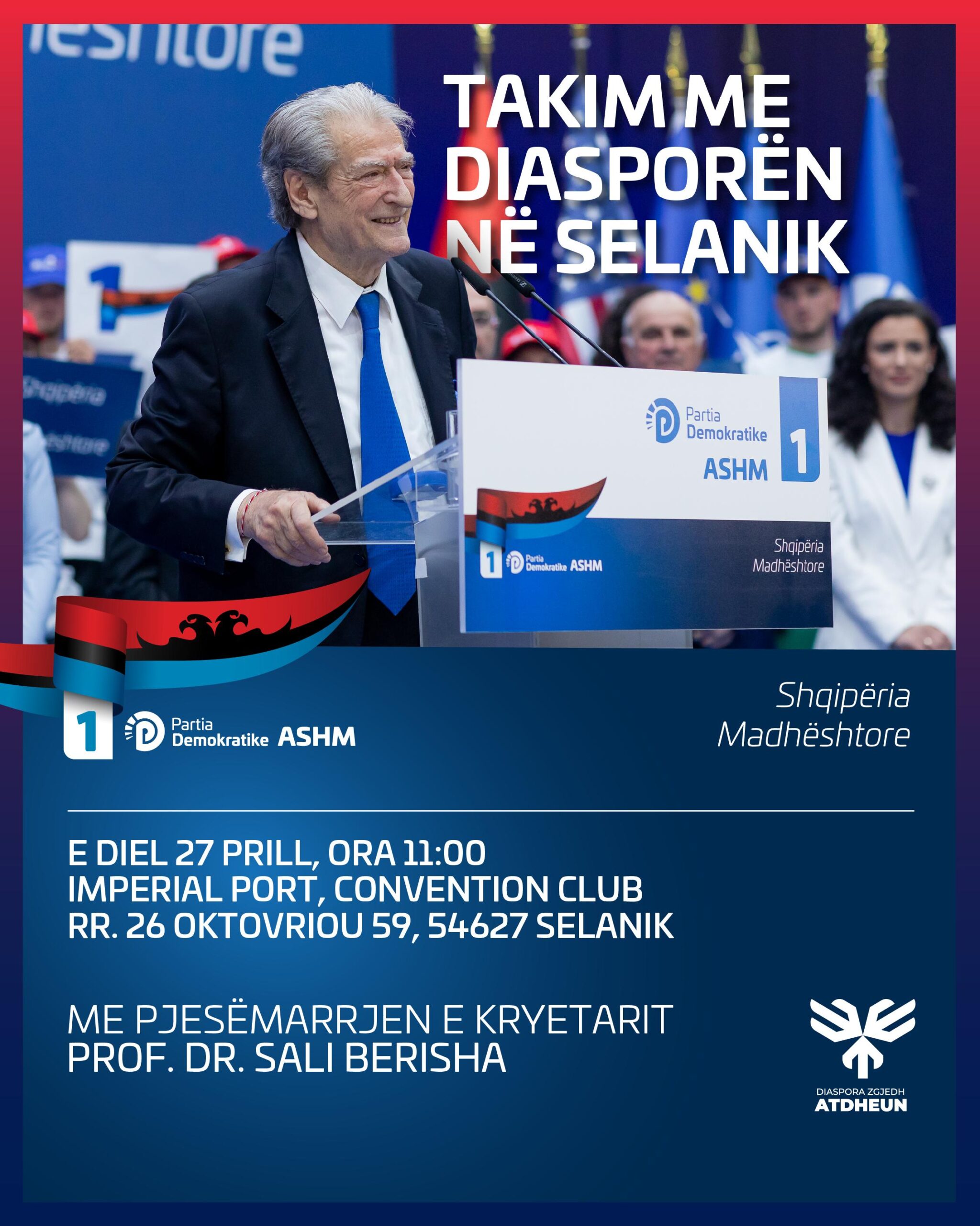 Sali Berisha ka njoftuar takimin e radhës me shqiptaret e diasporës. Kreu i PD-së pritet të vizitojë Selanikun në 27 Prill. Ky do të jetë takimi i fundit i Berishës në diasporë, pasi ka bërë disa të tilla në Itali dhe Greqi, i fundit ishte në Breshia në Itali ditën e diel në 13 prill. Kryedemokrati do të kërkojë votën e shqiptarëve të diasporës, e cila voton për herë të parë në këto zgjedhje. Në Britani dhe SHBA, Berisha ka marrë pjesë në takimet e diasporës përmes teknologjisë online, ndërsa takimet që ka zhvilluar në diasporë fizikisht janë: