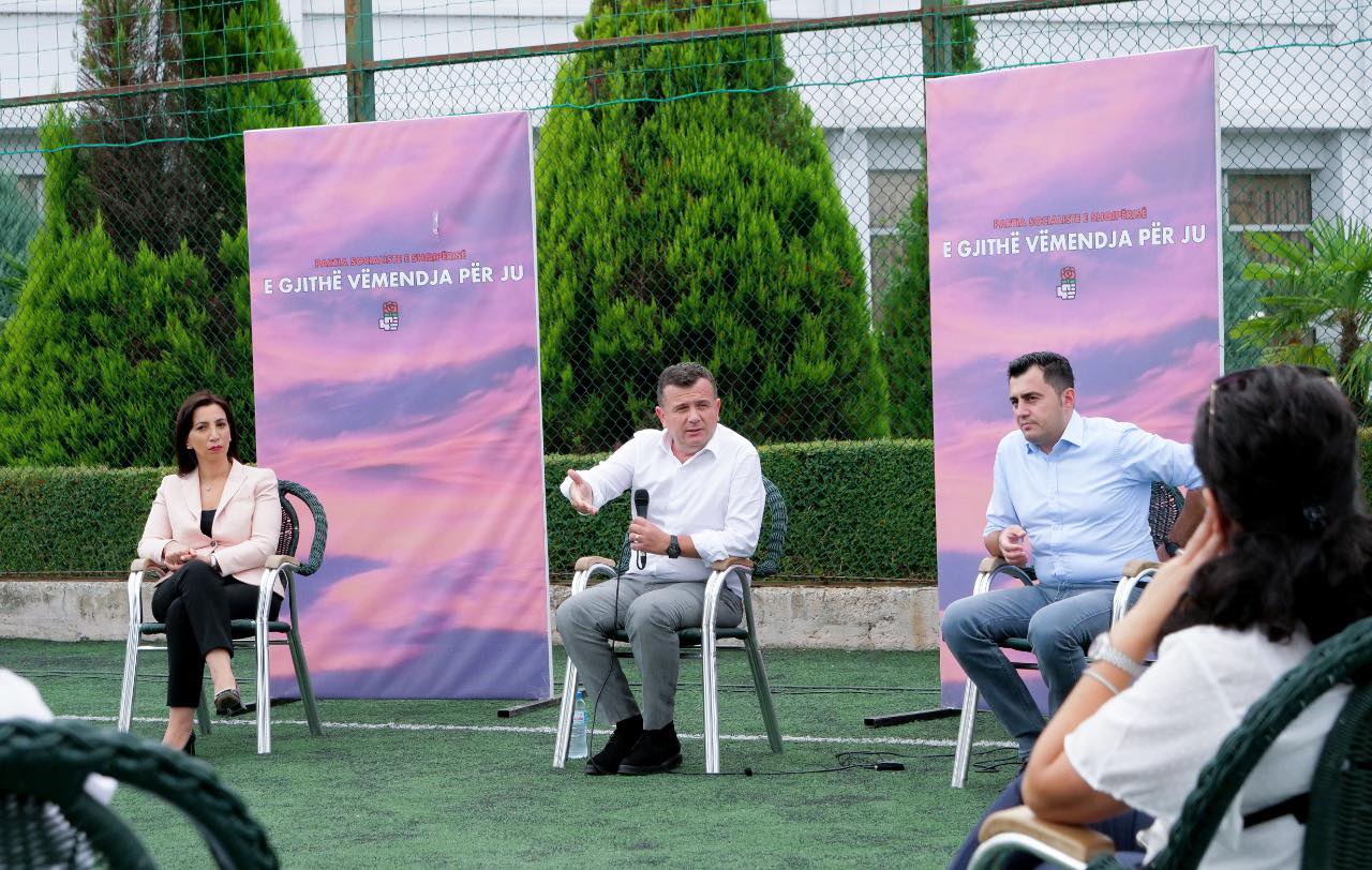 Evis Kushi e shqoëruar nga Sekretari i Partisë, Taulant Balla dhe kryebashkiaku i Elbasanit duke kërkuar vota në një takim ku askush nga pjesëmarrësit nuk shfaqet me maskë.
