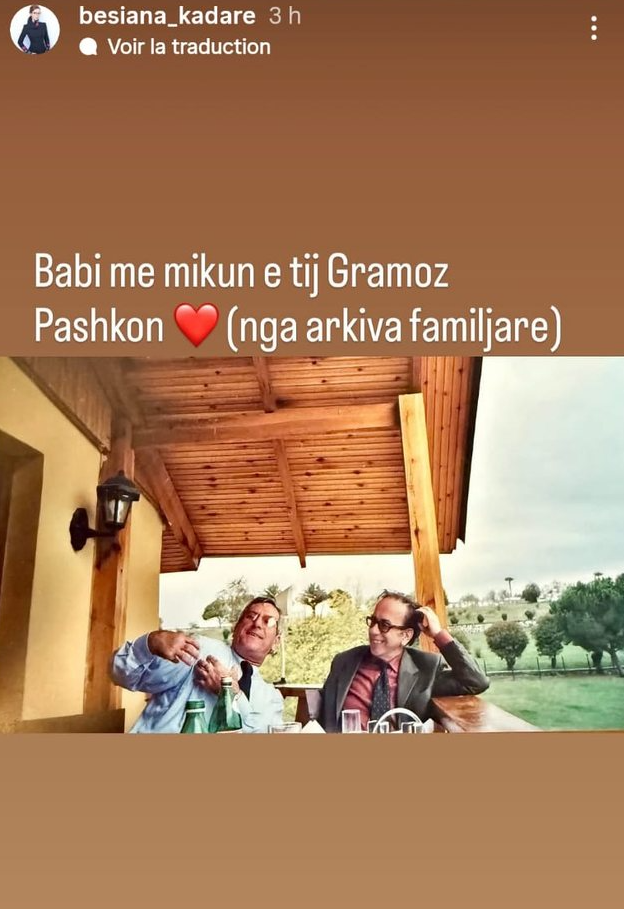 Besiana Kadare ka postuar në rrjetin social Instagram një foto të vjetër të babait të saj, Ismail Kadare me ekonomistin dhe politikanin Gramoz Pashko, i cili ndërroi jetë në vitin 2006. ”Babi me mikun e tij Gramoz Pashko (nga arkiva familjare)”,-shkruan ajo. Kujtojmë se shkrimtari i madh Ismail Kadare u nda nga jeta korrikun e vitit 2024 por duke lënë pas një trashëgimi të jashtëzakonshme. Ai njihet si shkrimtari më i madh i Shqipërisë me vepra kolosale si “Dimri i vetmisë së madhe” dhe “Gjenerali i ushtrisë së vdekur”.