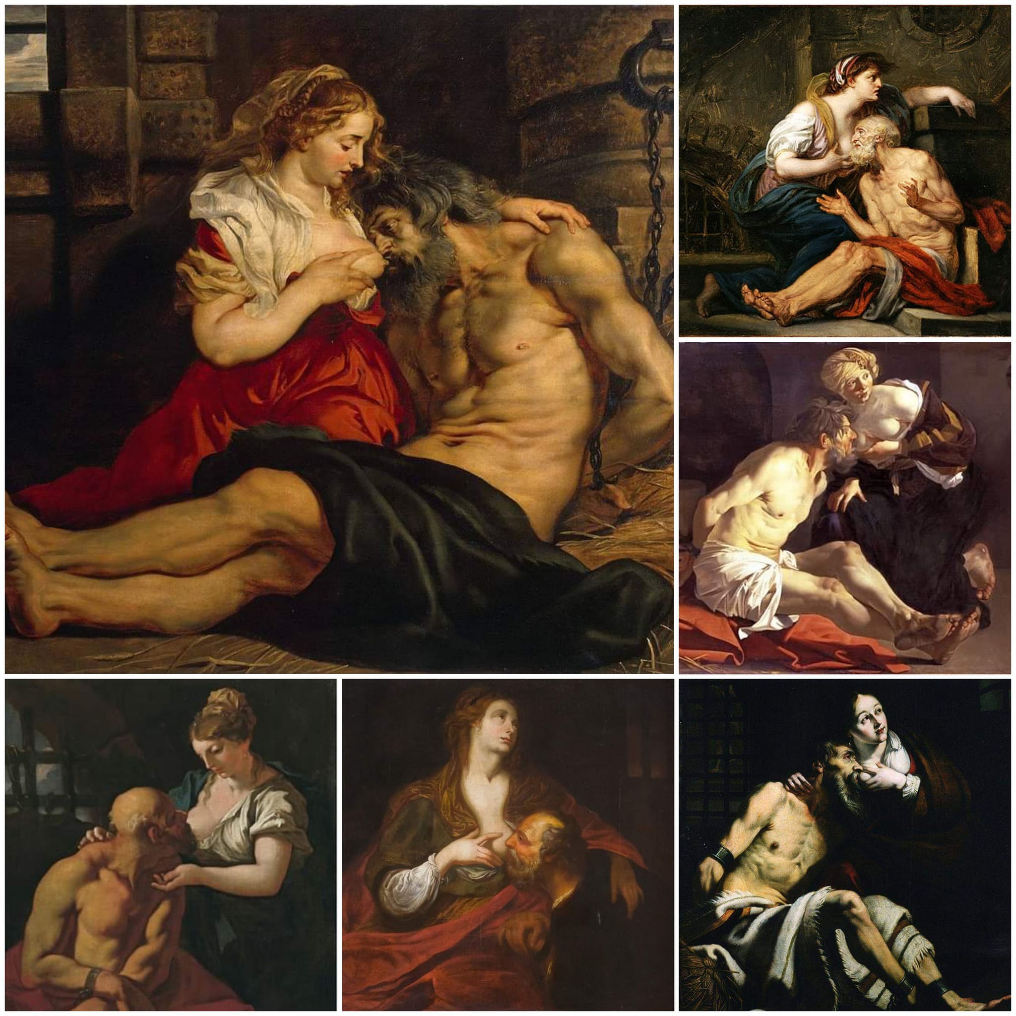 Të shumtë janë ata që e përfshinë mirëbërësen e mëshirshme Pero dhe babain e saj Kimon në galerinë e tyre krijuese, por ata që janë emblematik në këtë ngulm shprehish estetike janë; Rubens , Caravaggio, Dirck van Baburen, Charles Mellin, Bernardino Luini, Giovanni Antonio Pellegrini, Jan Janssens, Jean-Baptiste Greuze, Matthias Meyvogel, Giovanni Antonio Galli, Carlo Francesco Nuvolone, Johann Zoffany.