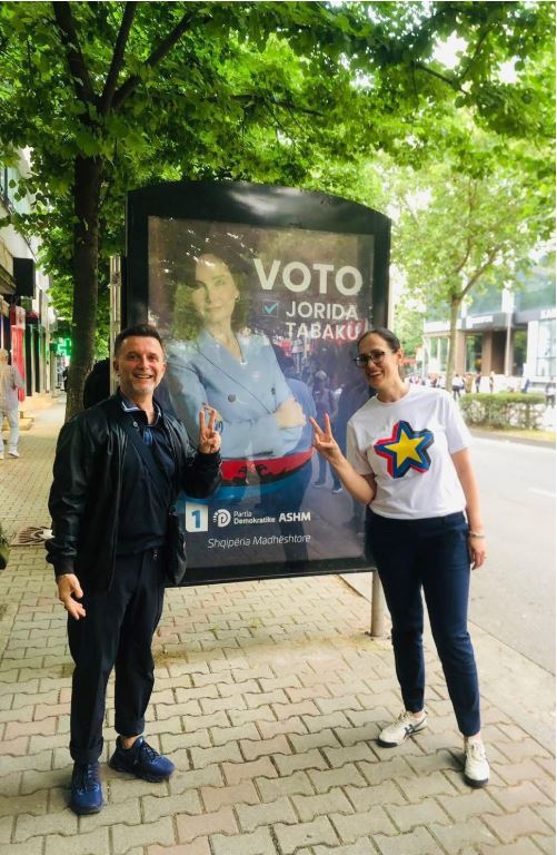 Erion Braçe dhe ministrja Delina Ibrahimaj, që janë pjesë e skuadrës së kandidatëve të PS për Tiranën ku dhe kandidojnë për një vend në Parlament, janë shfaqur duke pozuar para banerit-billbord të një prej kandidateve rivale, të deputetes të PD-së Jorida Tabaku. Fotoja tashmë është bërë virale dhe po kalon të gjithë xhiron e rrjetit. Sigurisht që dy kolegët socialistë e kanë postuar nëkuadër edhe të humorit elektoral dhe për t’i dhënë ngjyra më të buta fushatës.