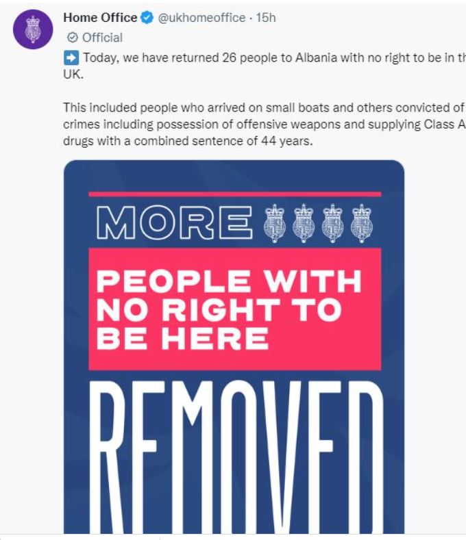 Lajmin e ka bërë të ditur, zyra e Home Office në Londër, e cila thotë se një pjesë e shqiptarëve kishin mbërritur në Mbretërinë e Bashkuar me varka. Ndërsa një pjesë tjetër ishin të dënuar për krime, duke përfshirë posedimin e armëve dhe furnizimin me drogë së klasit A.