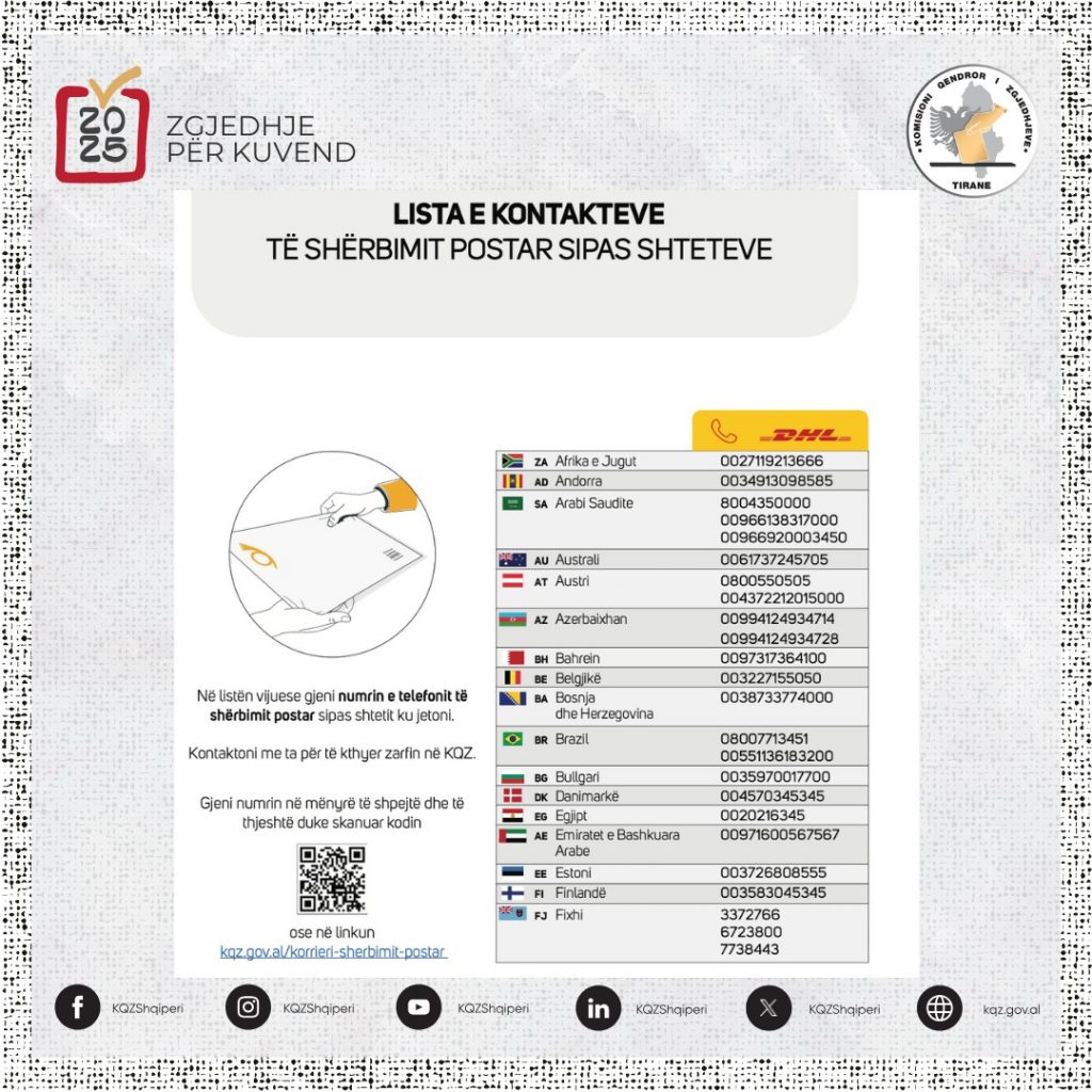 ‘Të gjithë ata zgjedhës nga jashtë, kudo në botë, por veçanërisht ata në Greqi, të cilët deri më sot nuk kanë marrë njoftim dhe/ose nuk janë kontaktuar nga DHL, qoftë nëpërmjet e-mailit apo nëpërmjet SMS-it, janë të lutur të kontaktojnë me shërbimin e DHL në vendin ku jetojnë, për t’u informuar mbi dërgesën postare nga KQZ.