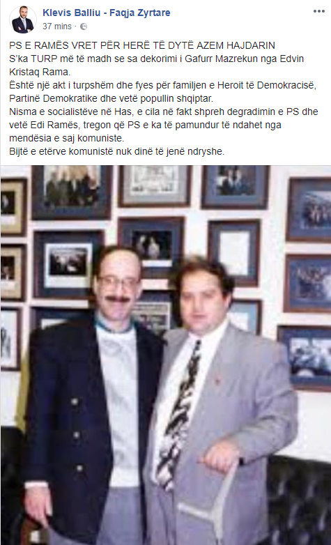 “PS e Ramës vret për herë të dytë Azem Hajdarin”. Kështu shprehet deputeti i PD, Klevis Balliu, pas vendimit të Këshillit Bashkiak Has për të shpallur “Qytetar nderi”, Gafurr Mazrekun ish-deputetin e PS. Balliu në postimin e tij në rrjetet sociale shkruan se, “kjo tregon degradimin e PS e cila e ka të pamundur të ndahet nga mendësia e saj komuniste”.