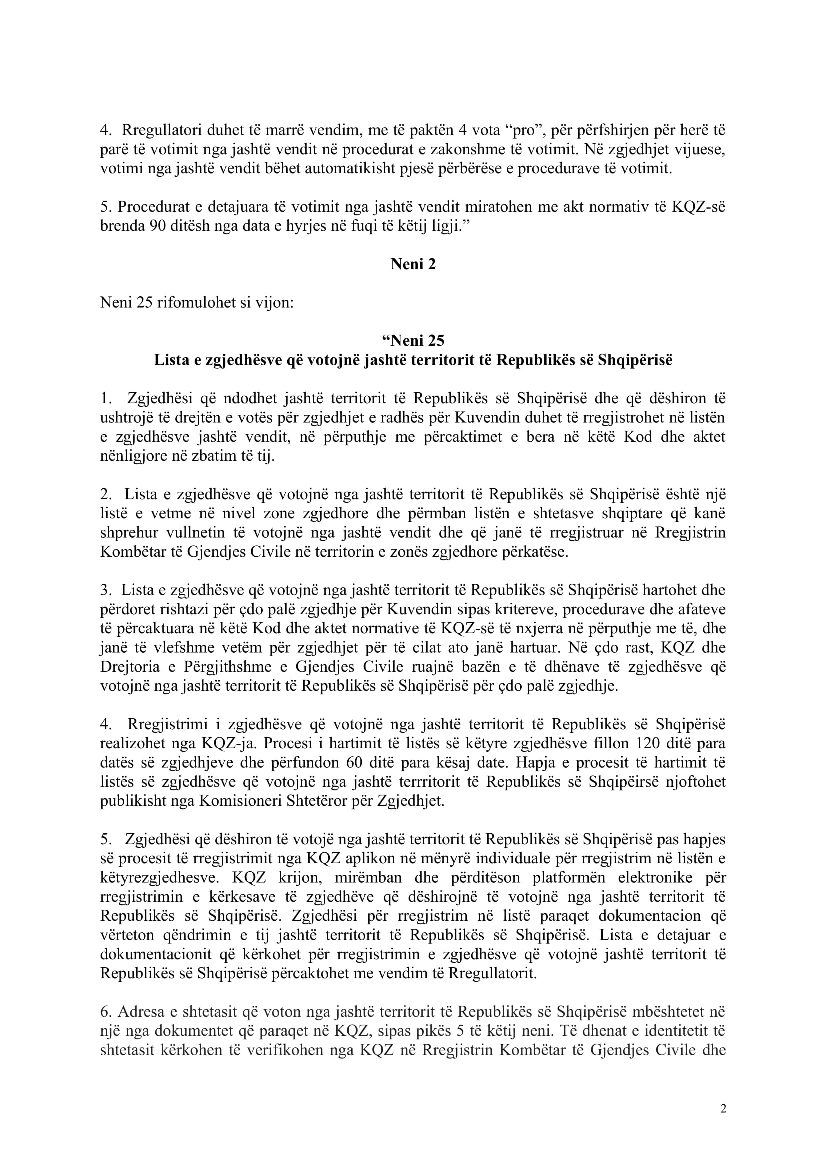 ”Menjëherë pas përfundimit të llogaritjes së rezultatit, sipas nenit 162 të këtij Kodi, KQZ-ja përllogarit shpërndarjen e mandateve për kandidatët fitues për secilin subjekt zgjedhor. Kandidatët e listës shumëemërore që i nënshtrohen votimit parapëlqyes rirenditen në bazë të numrit më të lartë të votave parapëlqyese për secilin kandidat. Kur numri i votave është i barabartë, renditja përcaktohet me short.