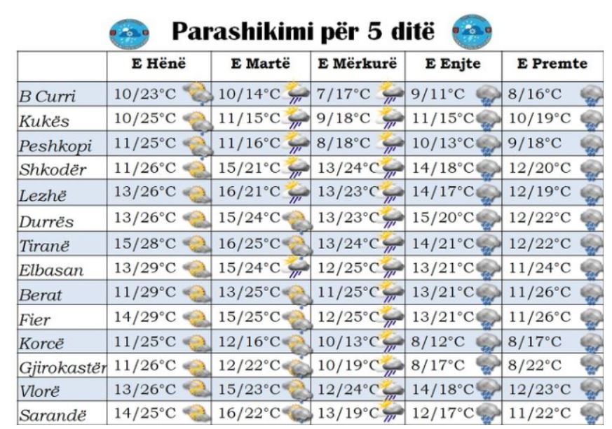 Për javën që presim përpara vendi ynë do të ndikohet përsëri nga kushte të paqëndrueshme atmosferike. Në këtë mënyrë për ditën e Hënë dhe të Martë moti parashikohet me kthjellime e alternime vranësirash deri të dendura më të theksuara në relievet malore në lindje.