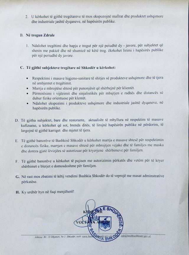 Kryetarja e bashkisë Shkodër, Voltana Ademi me anë të këtij vendimi ka njoftuar mënyrën se si do të punojnë tregtarët në tregjet e këtij qyteti, duke theksuar se asnjë produktet nuk do të lejohet ti tregtojë në ambiente publike, gjithashtu ka njoftuar se të gjithë baret dhe restorantet duhet të lirojnë hapësirat publike.