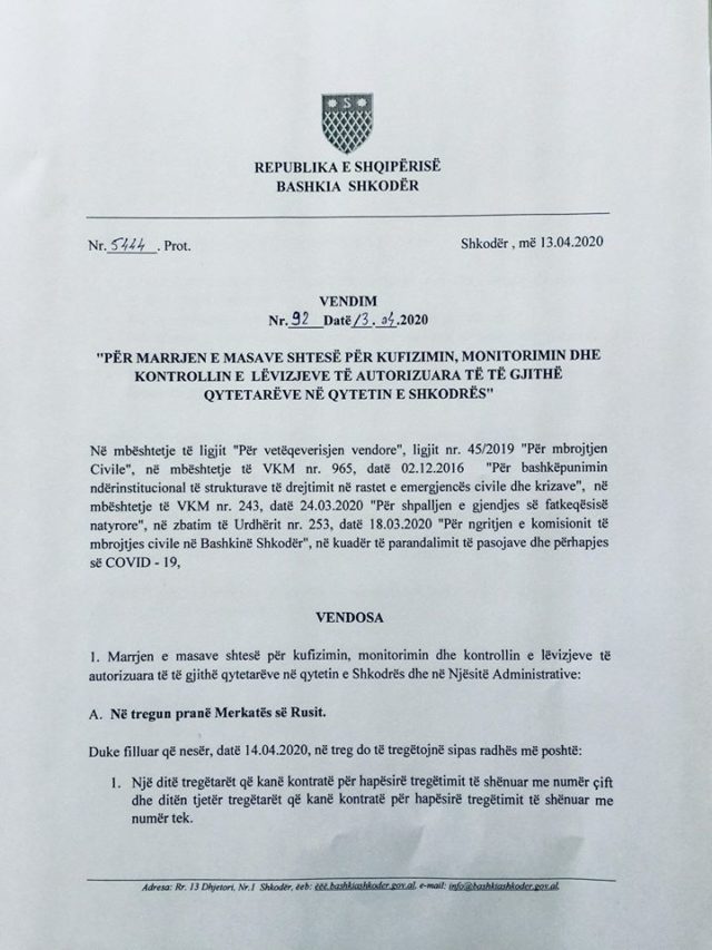 “PËR MARRJEN E MASAVE SHTESË PËR KUFIZIMIN, MONITORIMIN DHE KONTROLLIN E LËVIZJEVE TË AUTORIZUARA TË TË GJITHË QYTETARËVE NË QYTETIN E SHKODRËS”