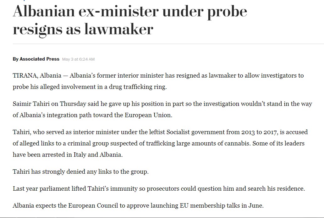 Shkrimi i “The Washington post” për dorëzimin e mandatit të deputetit nga Saimir Tahiri: