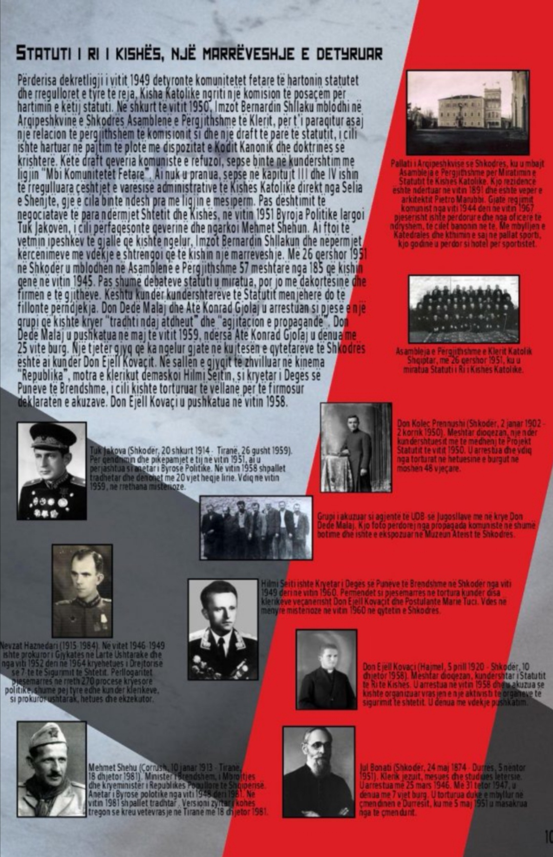 Më tej, Pjerin Mirdita, drejtor i “Vendit të Dëshmisë dhe Kujtesës”, prezantoi të gjitha panelet dhe u ndal edhe te shkatërrimii objekteve të kultit, ku krahas emrave të klerikëve që humbën jetën, si Dom Lazër Shantoja, Dom Ndre Zadeja, Alfron Tracki, Imzot Vinçenc Prenushi, At Anton Harapi, janë edhe emrat e atyre persekutorëve që morën pjesë në hetimet, gjykimet, torturat e dënimet e tyre.