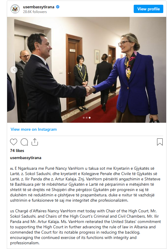 Gjatë takimit, VanHorn përsëriti angazhimin e Shteteve të Bashkuara për të mbështetur përpjekjet e Gjykatës së Lartë në forcimin e shtetit të së drejtës në Shqipëri.