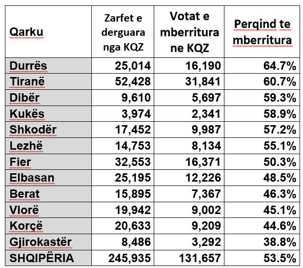 Sipas përqindjes së mbërritjes së votave në KQZ, kryesojnë qarqet Durrës (64.7%), Tiranë (60.7%), Dibër (59.3%). Fundin e tabelës e mbyllin qarqet Vlorë (45.1%), Korçë (44.6%), Gjirokastër (38.8%).