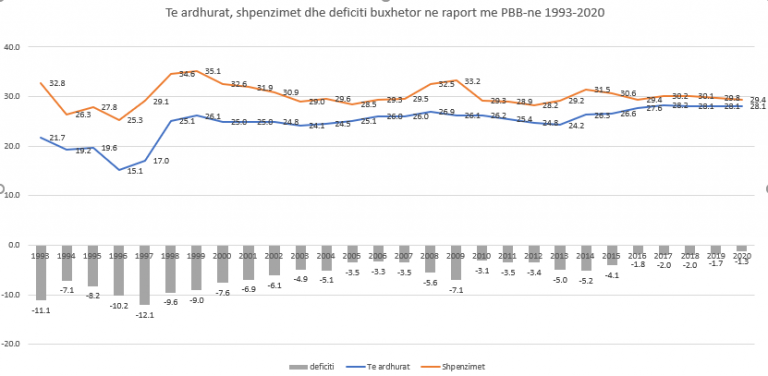 Në total buxheti i Shqipërisë ( shpenzimet) që nga viti 1993-2018 është luhatur në 30-32 për qind e të PBB-së, por në vitin 2019 shpenzimet totale janë projektuar të jenë edhe më të ulta në vetëm 29.4% e PBB-së, nga 30.1 % qe pritet të jenë këtë vit.