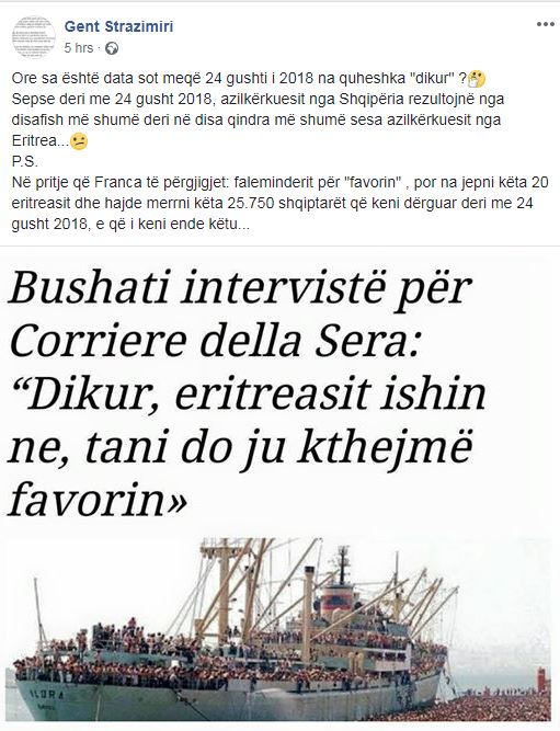 Përmes një postimi në Facebook, deputeti i PD, Gent Strazimiri ka komentuar vendimin e qeverisë për të pranuar 20 emigrantë nga Lindja e Mesme dhe Afrika të cilët prej disa ditësh gjendeshin në bregdetin e Italisë në pritje të ankorimit.