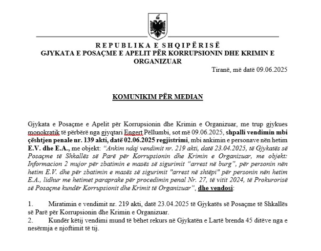 Gjykata e Apelit të Posaçëm ka lënë në fuqi masën e ”arrestit në burg” për kryebashkiakun e Tiranës, Erion Veliaj, duke mos i pranuar garancinë pasurore. Për të njëjtën dosje hetimore, në fuqi u la edhe masa e ”arrestit në shtëpi” për biznesmenin Elman Abule. Kryetari i Bashkisë së Tiranës doli të hënën në orën 14:00 para Apelit të GJKKO me kërkesën për zëvendësimin e masës së sigurisë “arrest me burg”.