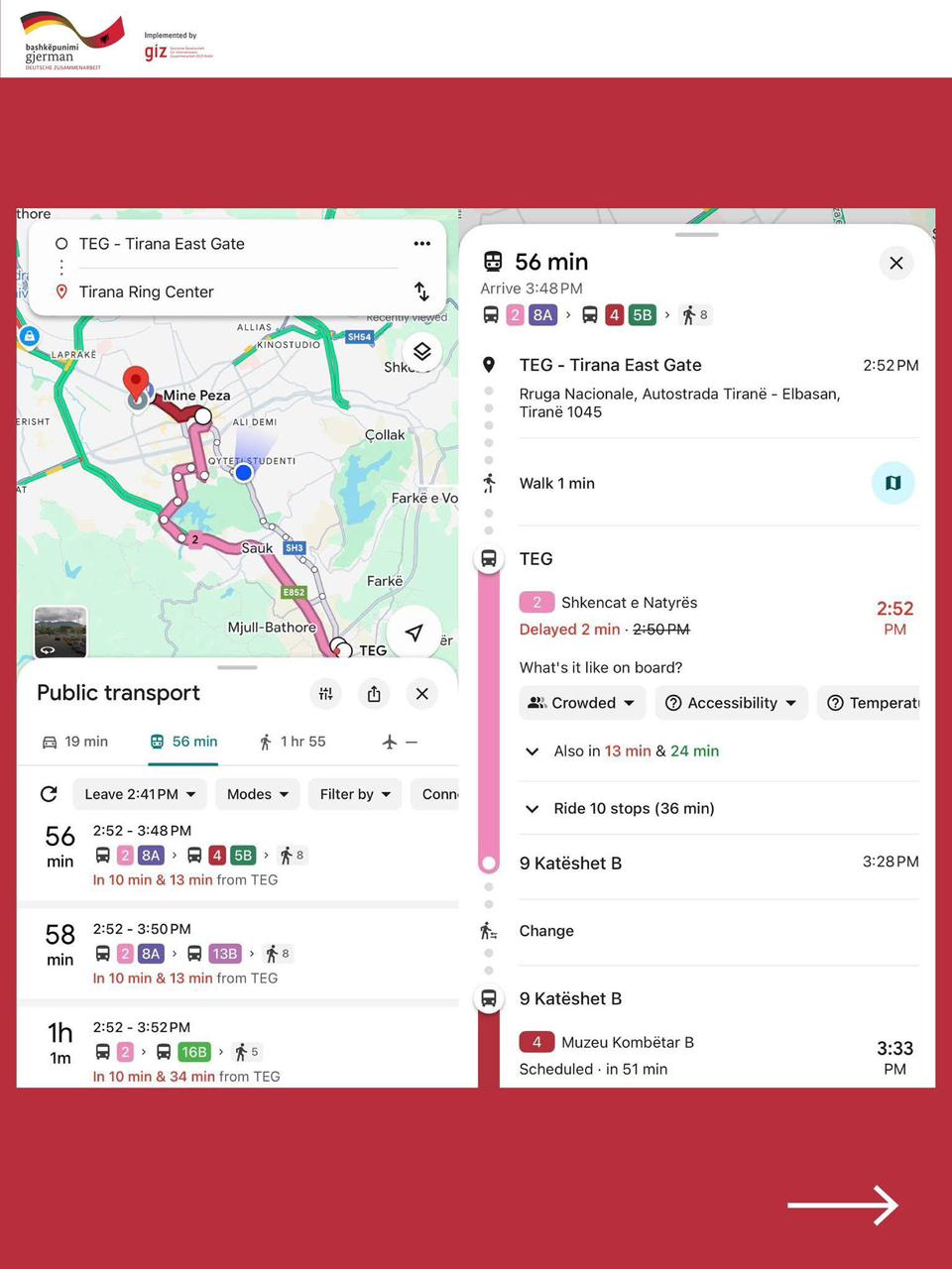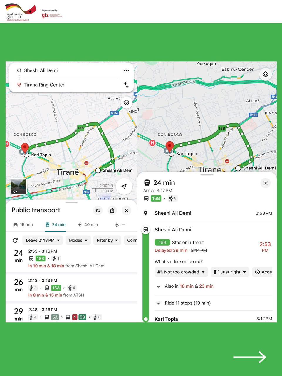 Ky projektt u realizua nga GIZ Albania dhe Bashkisë së Tiranës me mbështetjen e Albanian Technology Distribution (ATD). GTFS-RT (Real-Time General Transit Feed Specification) është integruar me sukses në Google Maps.