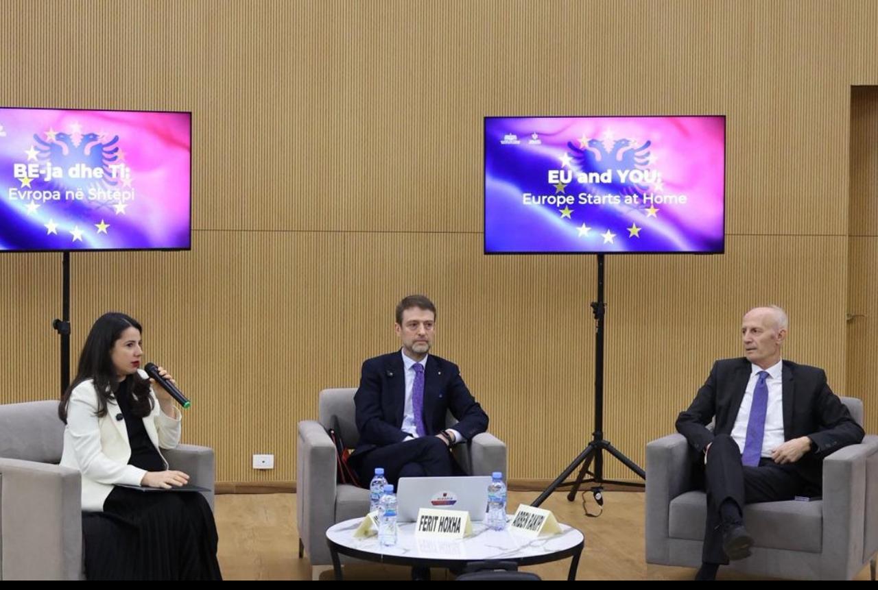 Ministri për Evropën dhe Punët e Jashtme, Ferit Hoxha me Ministren e Shtetit për Administratën Publike dhe Antikorrupsionin, Adea Prideni nisën këtë të premte një cikël bashkëbisedimesh me fokus Evropën, me studentë dhe pedagogë të Shkollës së Magjistraturës në Tiranë. Fokusi i këtij turi që do të vijojë në të gjithë Shqipërinë është dialogu për procesin e integrimit dhe për të ardhmen e përbashkët evropiane nën titullin: “BE dhe Ti-Evropa fillon këtu”.