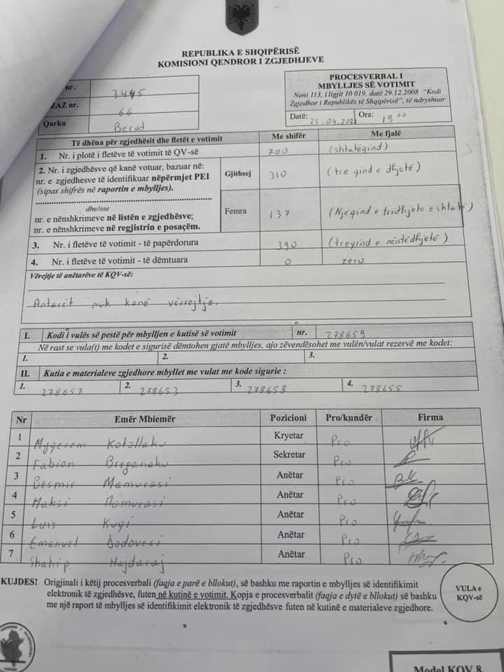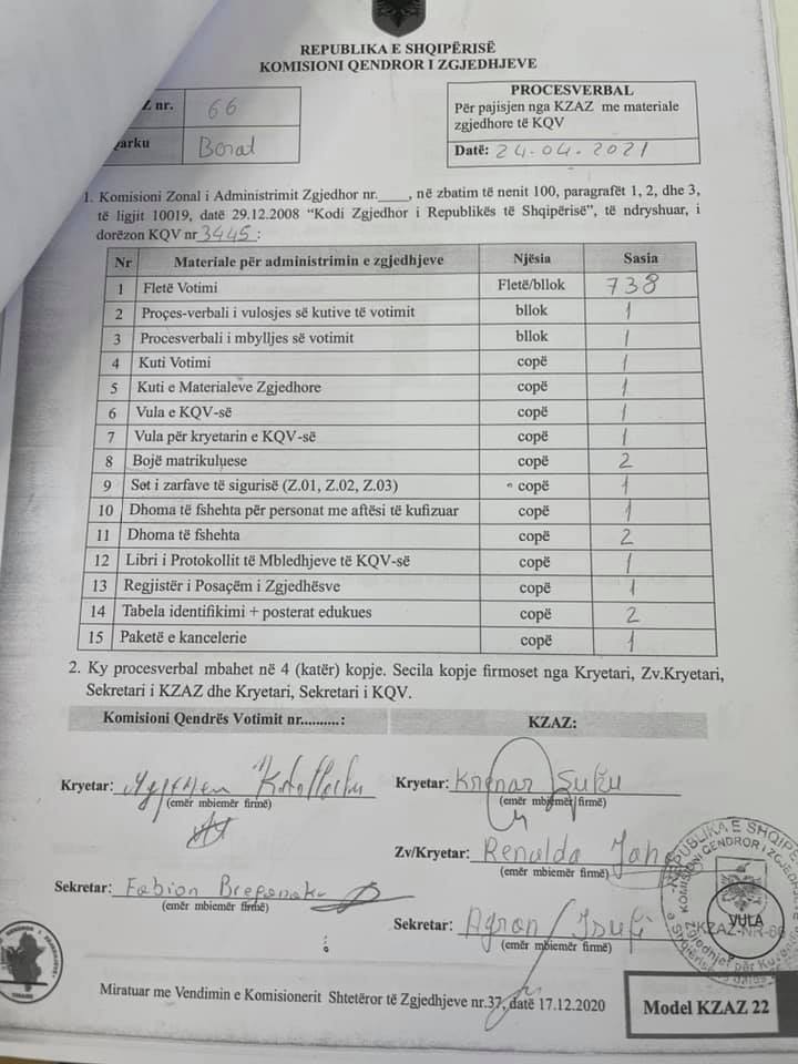 Ai shkruan se në procesverbalin e marrjes në dorëzim raportohen 738 fletë votimi të tërhequra, por nga ana tjetër, në procesverbalin e mbylljes së votimit raportohen 700 fletë votimi.