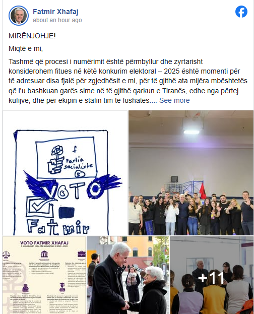 Tashmë që procesi i numërimit është përmbyllur dhe zyrtarisht konsiderohem fitues në këtë konkurrim elektoral – 2025 është momenti për të adresuar disa fjalë për zgjedhësit e mi, për të gjithë ata mijëra mbështetës që iu bashkuan garës sime në të gjithë qarkun e Tiranës, edhe nga përtej kufijve, dhe për ekipin e stafin tim të fushatës.