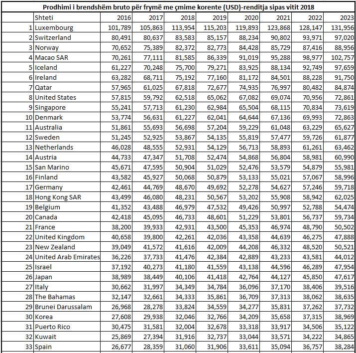 Shteti, që ka të ardhurat për frymë më të lartat në botë është Luksemburgu, me rreth 114 mijë dollarë të vlerësuara për 2018-n, sipas shifrave të FMN-së.