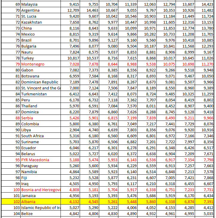 Në rajon, të ardhurat më të larta i ka Mali i Zi, me 8,644 dollarë për frymë, duke u renditur e 79-a në botë, e ndjekur nga Serbia me 6,815 dollarë (vendi 88); Maqedonia, me 5,953 dollarë (95) dhe Bosnjë Hercegovina me 5,704 dollarë (e 100).