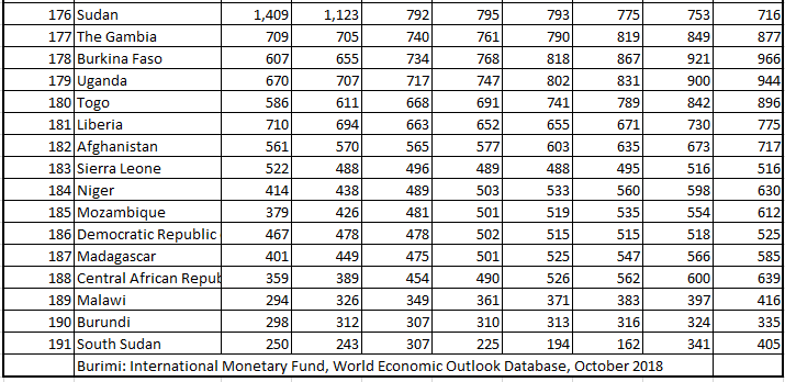 Në kontrast, shtetet me të ardhura më të ulëta për frymë janë Burundi dhe Sudani i Jugut, me rreth 307 dollarë për frymë secili.