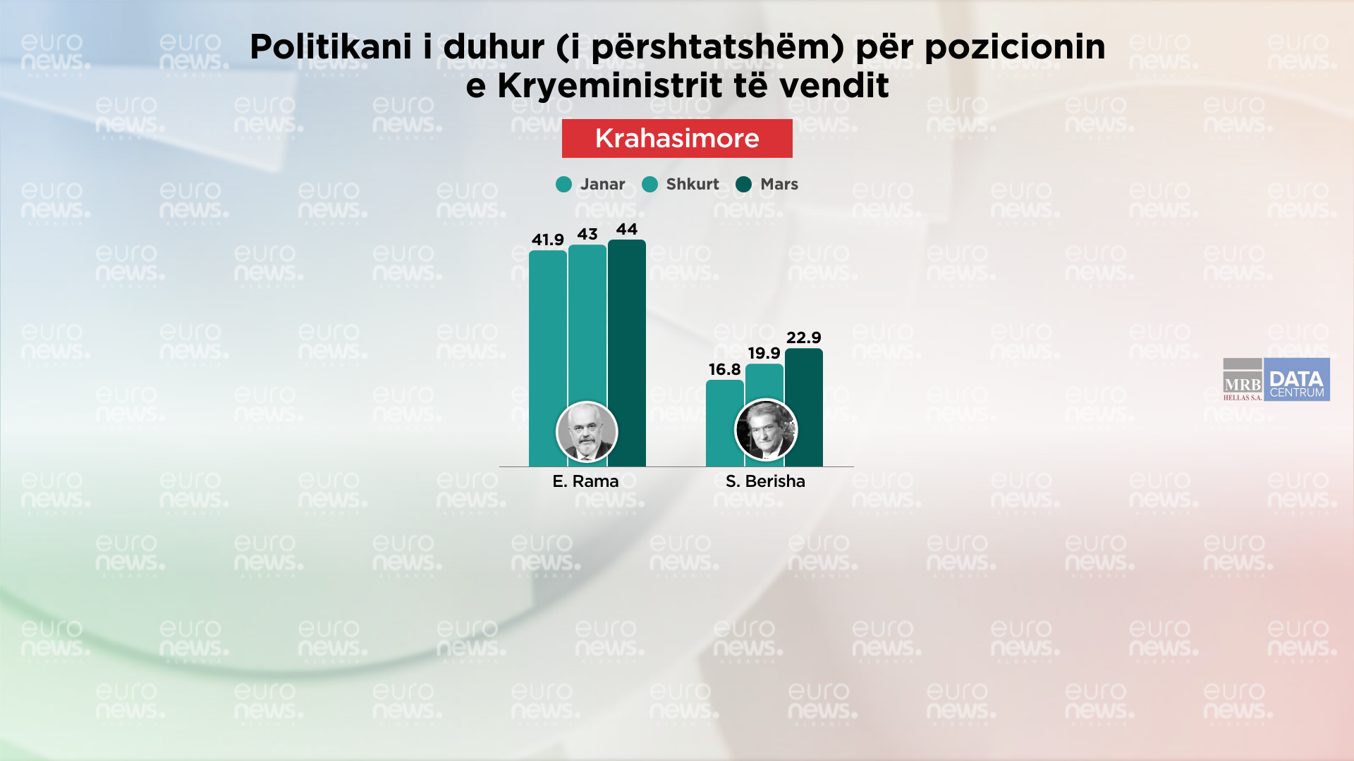 44% e qytetarëve thonë se më i përshtatshmi për kryeministër është Edi Rama. Pas tij me radhë 22.9% Sali Berisha, 9.9% Adriatik Lapaj, 5.3% Agron Shehaj, 1.9% Arlind Qori dhe 11.2% janë përgjigjur nuk e di.
