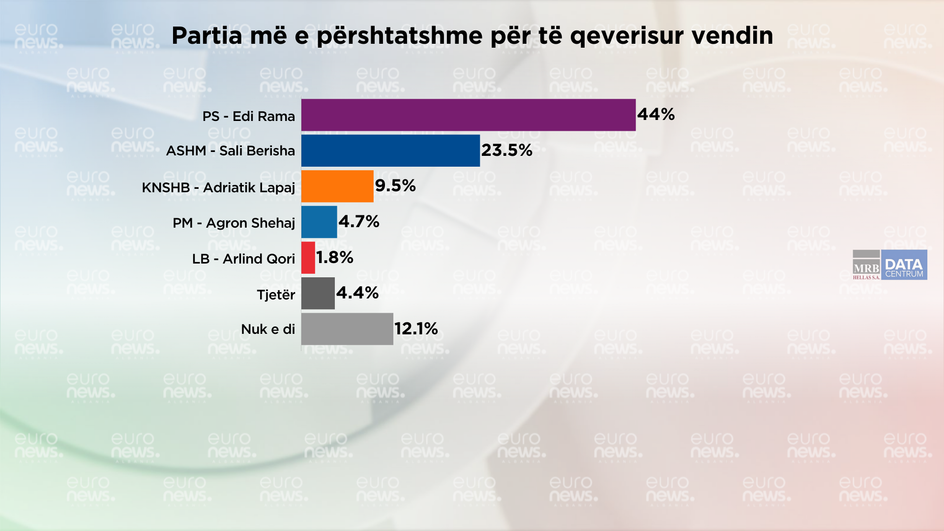 44% e qytetarëve shprehen se është Partia Socialiste, 23.5% Partia Demokratike dhe koalicioni saj, 9.5% Koalicioni Nisma Shqipëria Bëhet, Partia Mundësia 4.7%, 1.8% Lëvizja Bashkë, dhe 12.1 janë përgjigjur nuk e di.