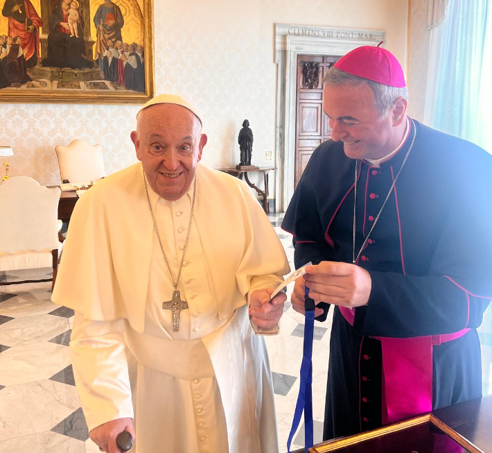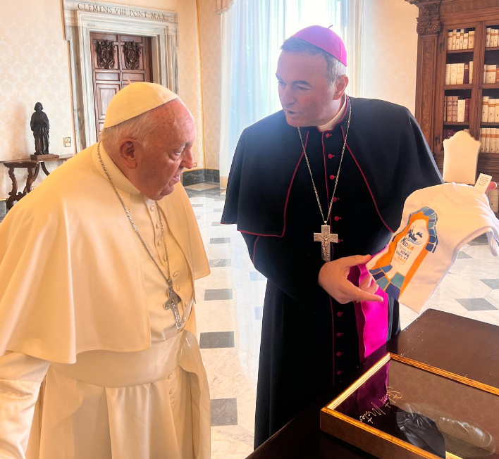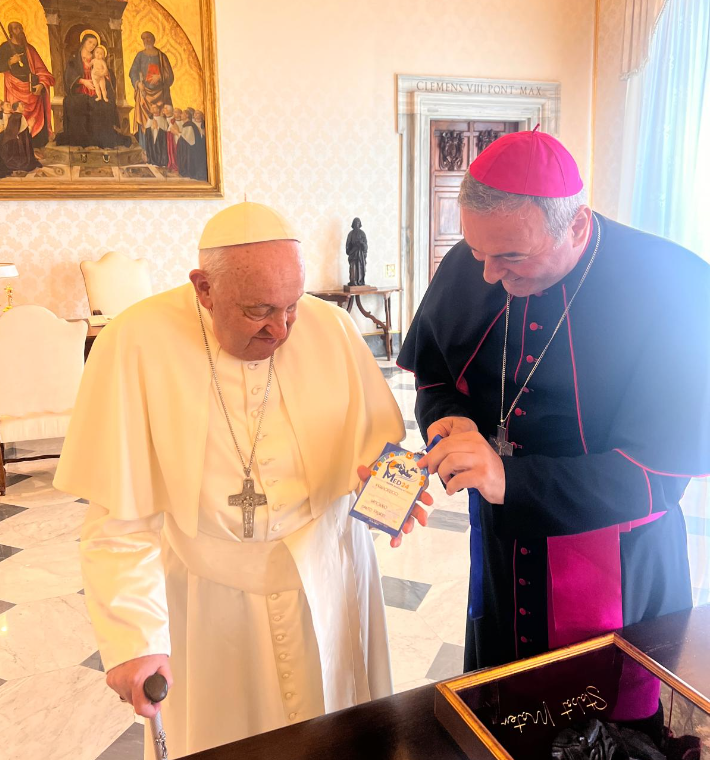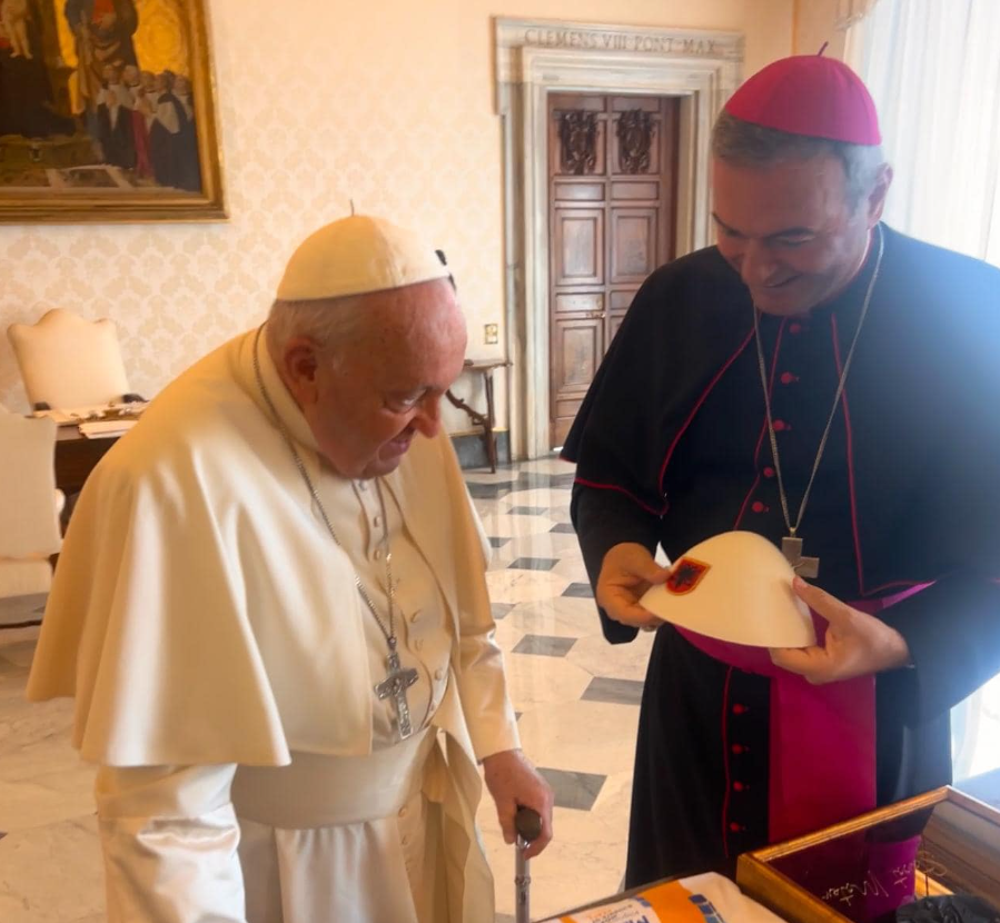 Arqipeshkvi i prezantoi Papës një bluzë dhe një etiketë duke treguar ashtu, në mënyrë konkrete dhe simbolike njëkohësisht, regjistrimin e tij për takimet mesdhetare “MED 24” në Tiranë. Në fund, ai i dërgoi bekimin e tij apostolik Arqidioqezës shqiptare.