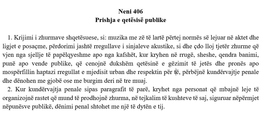 1. Krijimi i zhurmave shqetësuese, si: muzika me zë të lartë përtej normës së lejuar në aktet dhe ligjet e posaçme, përdorimi jashtë rregullave i sinjaleve akustike, si dhe çdo lloj tjetër zhurme që vjen nga sjellje të papëlqyeshme apo nga kafshët, kur kryhen në rrugë, sheshe, qendra banimi, punë apo vende publike, që cenojnë dukshëm qetësinë e gëzimit të jetës dhe pronës apo mospërfillin haptazi rregullat e mjedisit urban dhe respektin për të, përbëjnë kundërvajtje penale dhe dënohen me gjobë ose me burgim deri në tre muaj.