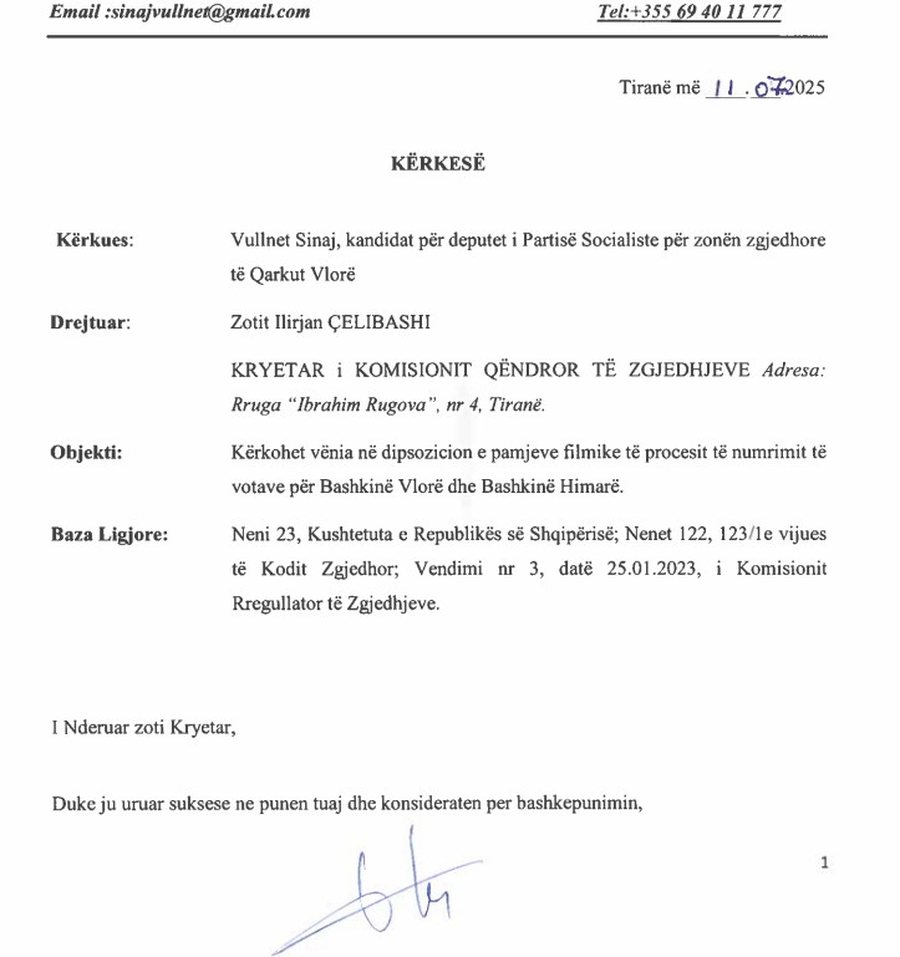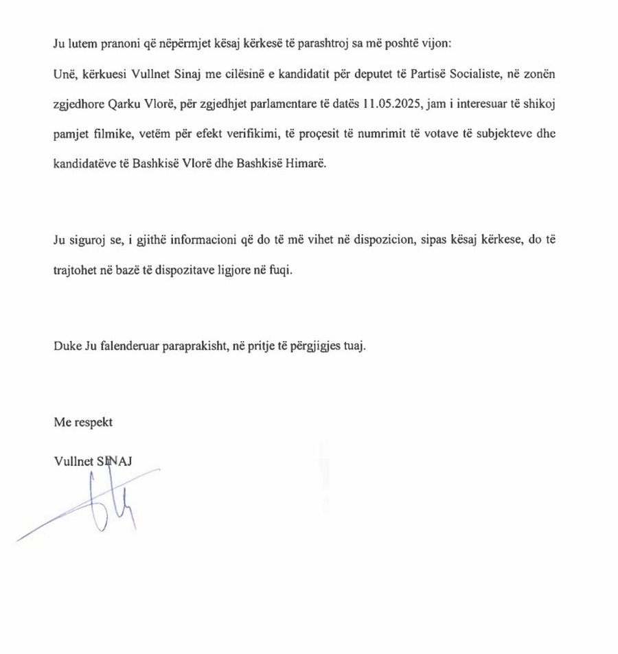 Në një kërkesë zyrtare drejtuar kreut të KQZ-së, Ilirjan Celibashi, ai thekson se ka interes të verifikojë me transparencë çdo detaj të numërimit. Sinaj sqaron se pamjet do të përdoren vetëm për qëllime verifikimi dhe premton se çdo informacion i marrë do të trajtohet sipas ligjit.