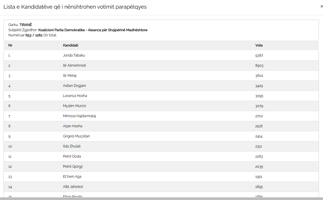 PD ka marrë 13 mandate në qarkun e Tiranës, ku 12 janë në lista të sigurta dhe nga votat preferciale do të hyjë në Parlament vetëm një deputet. Duket një garë e fortë mes dy kandidatëve. Jorida Tabaku dhe Ilir Alimehmeti janë në një garë për të fituar mandatin e deputetit, por duket se Tabaku po shkëputet. Tabaku ka arritur të marrë deri tani 9387 vota. Ndërsa, Ilir Alimehmeti ka marrë 8903 vota. Janë më shumë se 484 vota në favor të Tabakut. E vështirë të përmbyset, por gjithsesi procesi ende nuk ka mbaruar.