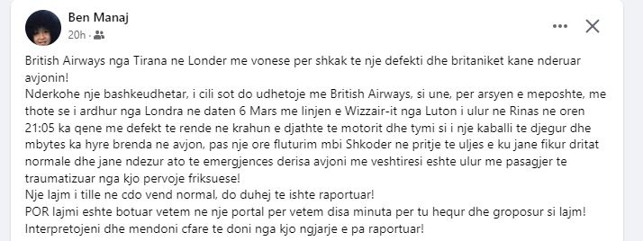 Gazetari i njohur Ben Manaj bën me dije në një status të tij në facebook mbi një avion të linjës Wizzair që ishte me difekt dhe rrezikoi seriozisht udhëtarët.