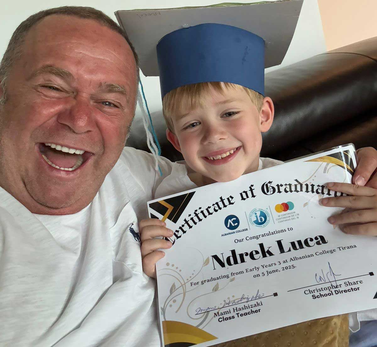 Në një kohë kur rrjetet sociale janë përplot me lajme, opinione dhe imazhe që shpesh kërkojnë të imponohen, ndonjëherë shfaqen pamje që nuk kërkojnë të duken, por vetëm të ndjehen. Një prej tyre është fotografia që sipërmarrësi Gjergj Luca ka ndarë me ndjekësit e tij, një çast intim e prekës, ku shfaqet krahas të birit të tij, Ndrek Luca, në një ditë të shënuar për të dy, diplomimi i vogëlushit nga cikli Early Years 3 në Albanian College Tirana, më 5 qershor 2025.