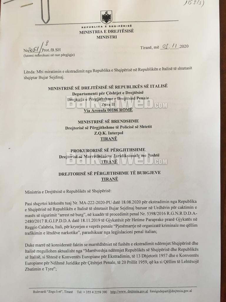 Pasi ka shqyrtuar të gjitha dokuementet, ministrja e Drejtësisë, Etilda Gjonaj ka firmosur urdhrin për ekstradimin nga Tirana në drejtim të Romës të këtij personazhi që dyshohet të jetë “njeriu që luan fijet e Ndraghetas në Shqipëri e Ballkan”.