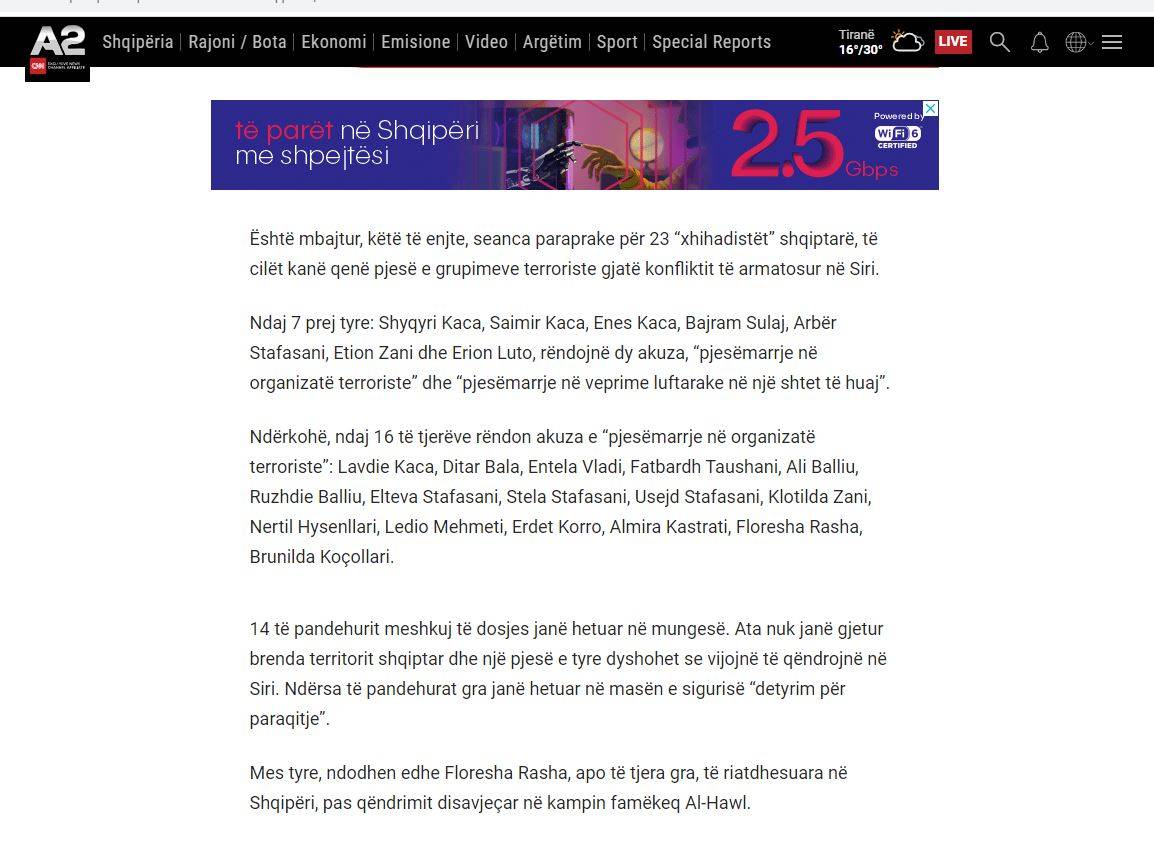 Për 23 “xhihadistët” shqiptarë, këtë të enjte u mbajt seanca paraprake, të cilët kanë qenë pjesë e grupimeve terroriste gjatë konfliktit të armatosur në Siri. Ndaj 7 prej tyre: Shyqyri Kaca, Saimir Kaca, Enes Kaca, Bajram Sulaj, Arbër Stafasani, Etion Zani dhe Erion Luto, rëndojnë dy akuza, “pjesëmarrje në organizatë terroriste” dhe “pjesëmarrje në veprime luftarake në një shtet të huaj”.