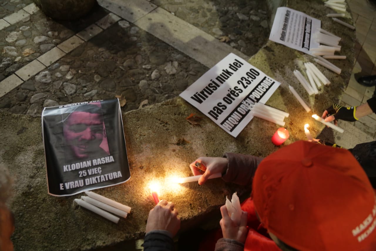 ”E vrau diktatura”, shkruhet në një nga pankartat, ndërsa në një tjetër shkruhet ”Virusi nuk del pas orës 23:00”.