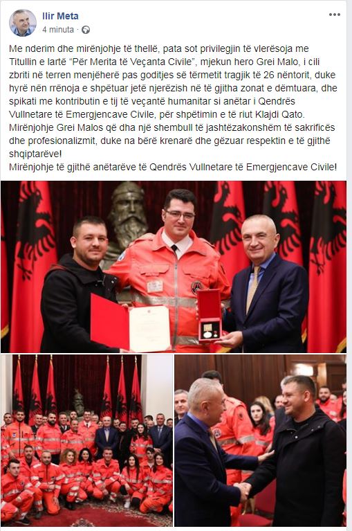 Mirënjohje Grei Malos që dha një shembull të jashtëzakonshëm të sakrificës dhe profesionalizmit, duke na bërë krenarë dhe gëzuar respektin e të gjithë shqiptarëve! Mirënjohje të gjithë anëtarëve të Qendrës Vullnetare të Emergjencave Civile!”, shkruan Meta.