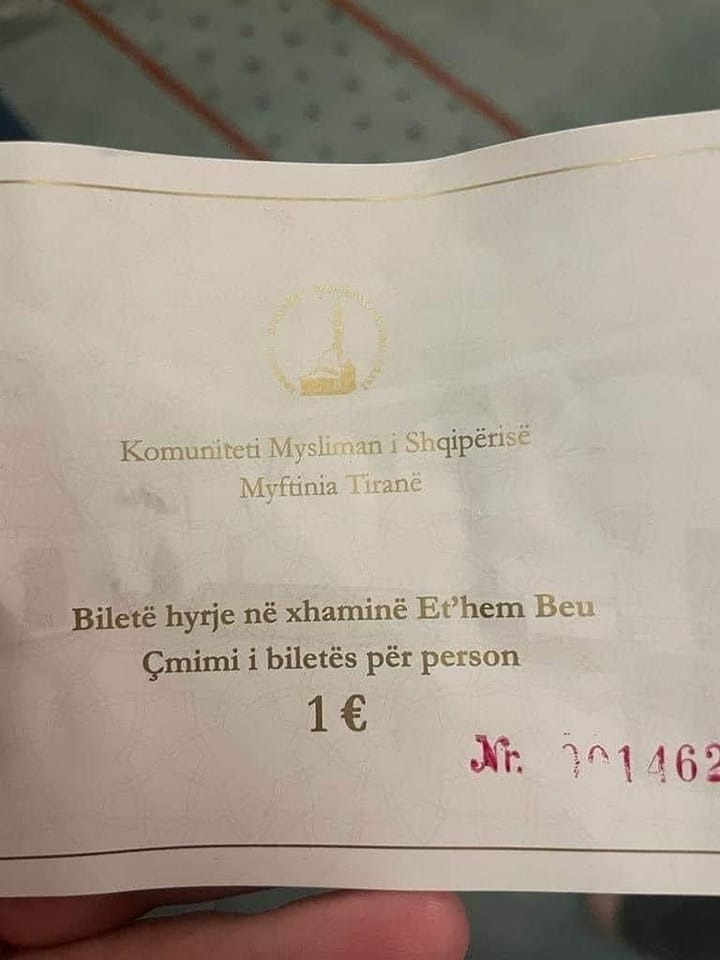 Sqarim për besimtarët dhe opinionin publik. Në rrjetet sociale dhe në disa media po qarkullon kjo biletë, e lëshuar nga Myftinia Tiranë, përkatësisht stafi drejtues i Xhamisë Et’hem Beu.
